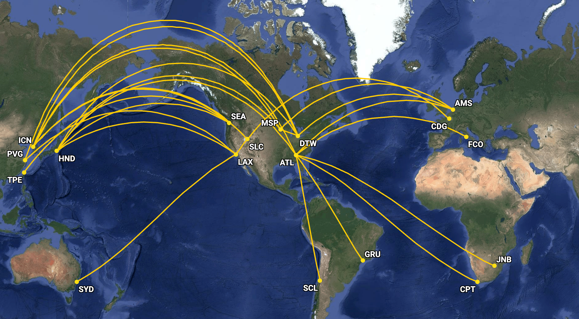 (ATL)、アムステルダム スキポール空港 (AMS)、ローマ レオナルド ダ ヴィンチ フィウミチーノ空港 (FCO) などの目的地へのフライトを含む