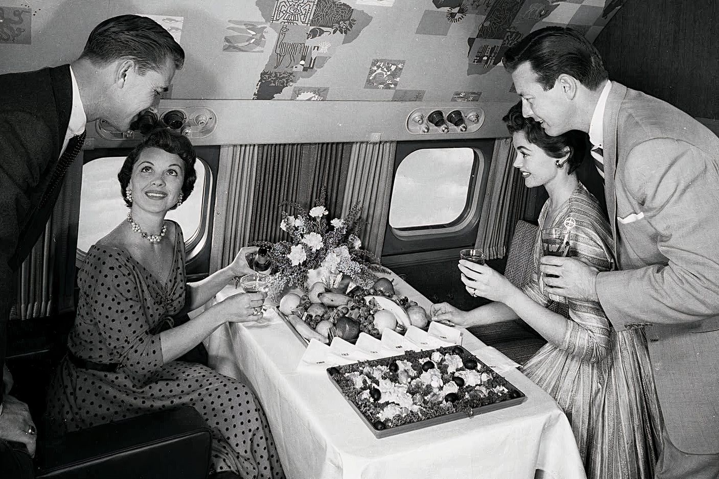 競合他社が競争を強化する中、ユナイテッドは市場でのリードを維持しようと努めた。おそらく最も印象的なのは、1953 年からロサンゼルスとサンフランシスコ、シカゴとニューヨークを結ぶ「エグゼクティブ」便を毎日運航しており、本質的には翼のある紳士クラブでした。シングル モルト ウィスキーとジン マティーニを最高級のキューバ産葉巻と組み合わせ、2 人のスチュワーデスがサービスするフルコース ステーキ ディナー テーブルをお楽しみください。