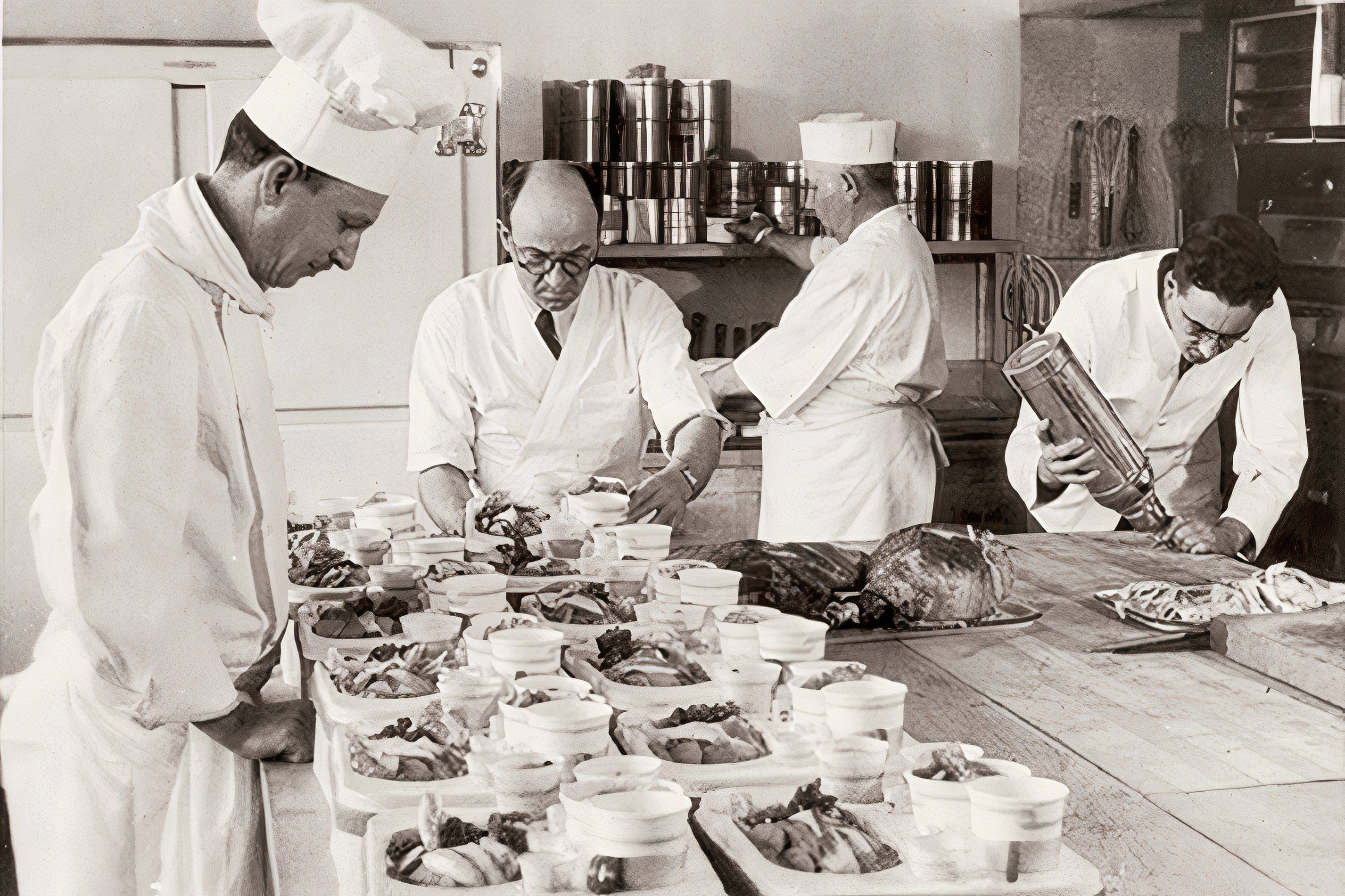 このユニークな体験を可能にするために、ユナイテッド航空は 1936 年にカリフォルニア州オークランドにワールド フライト キッチンを開設しました。このキッチンは、大陸横断便に新鮮な食事を提供するために、サンフランシスコのユナイテッド航空のハブ空港の近くに戦略的に配置されました。これに合わせて、ユナイテッド航空はボーイング 247 (およびその後買収された DC-3) にも食事の準備を支援するキッチンを設置しました。