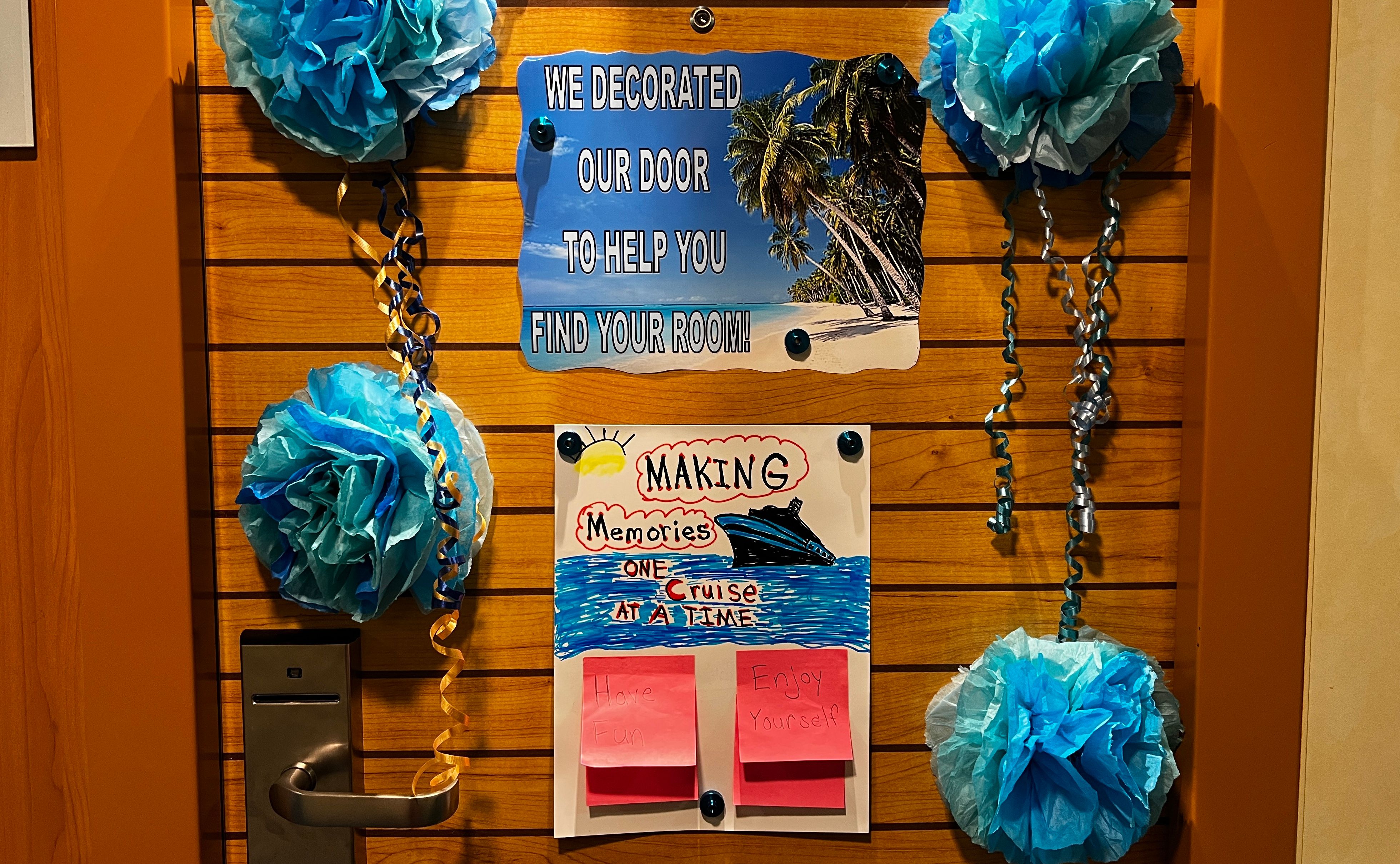 多くの人にとって、ステートルームのドアを華やかにするのはクルーズの伝統です。誕生日、記念日、その他の特別な日を祝うのに最適な方法です。また、ドアをパーソナライズすると、バハマママを数回使用した後にすべてのドアが同じように見え始めたときに、キャビンを見つけやすくなります。