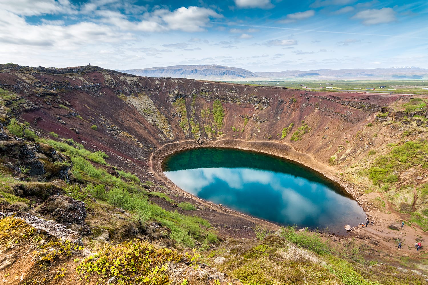 旅程に追加するのに最適な迂回路の 1 つは、ケリド クレーターです。グトルフォスからは南西に車で 1 時間の距離にあり、ゴールデン サークルを長い環状にしてレイキャビクに戻る途中に訪れることができます。