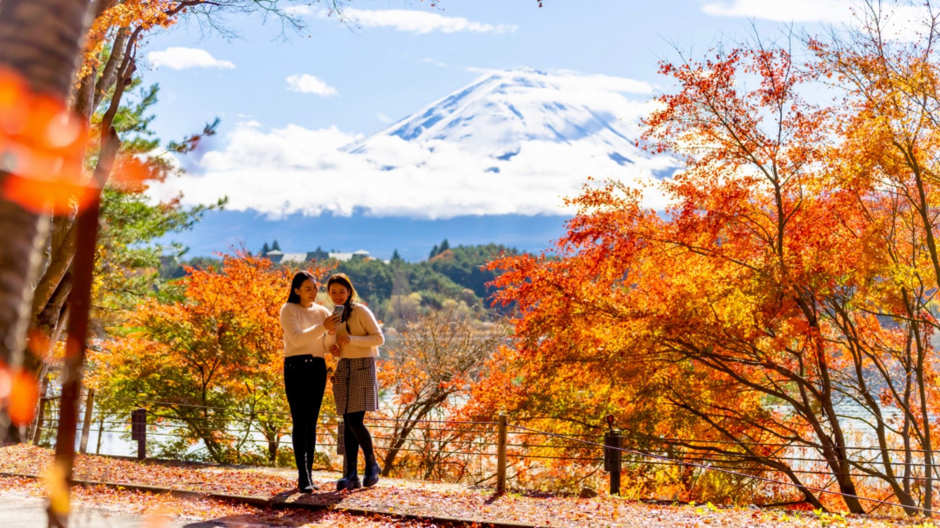女性は富士山の前で日本の前で写真のためにポーズをとる