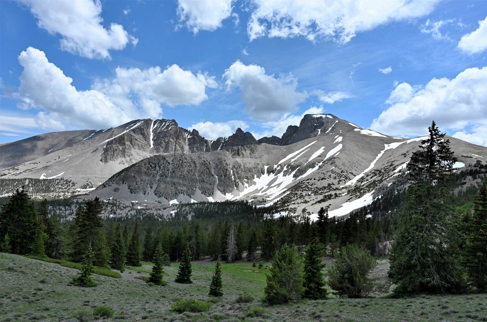 このセクションでは、大盆地の砂漠の広がり、南スネークレンジマウンテン、古代のブリストルコーンパインズ、ヨセミテのエルピタンとハーフドームに対するグレートベイスンの答え:ウィーラーピーク自体をすぐに示します。ネバダ州で13,063フィートの2番目に高いピークで、州で唯一の氷河です。