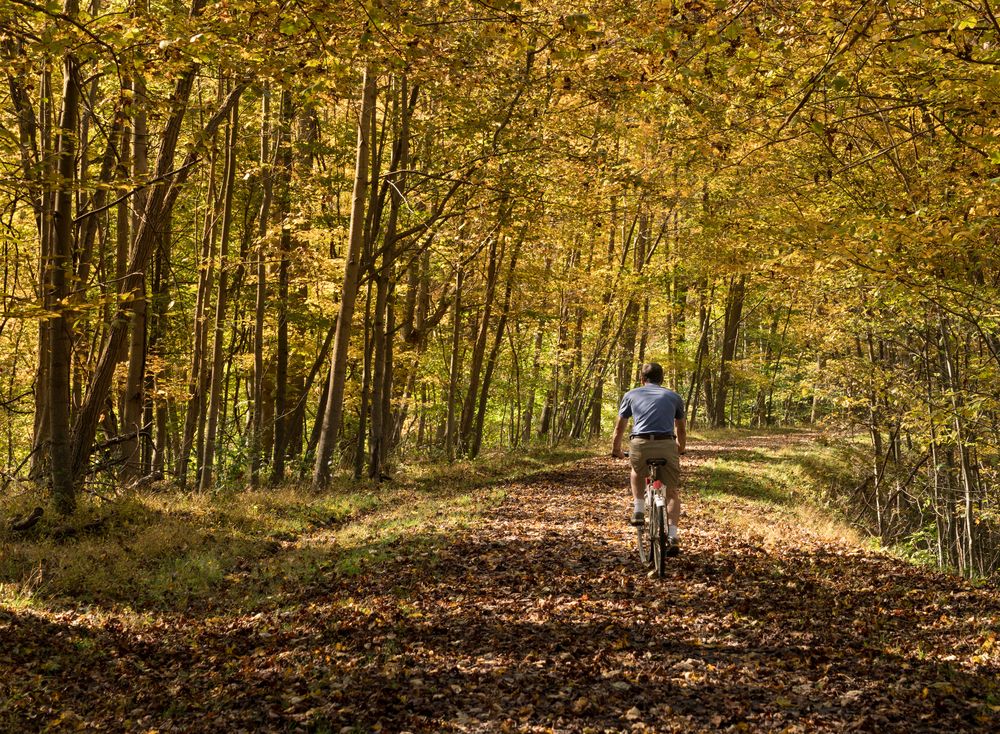 ジャクソン リバー シーニック トレイルはアレガニー高原を通る簡単なハイキングで、サイクリングや家族連れに最適です。