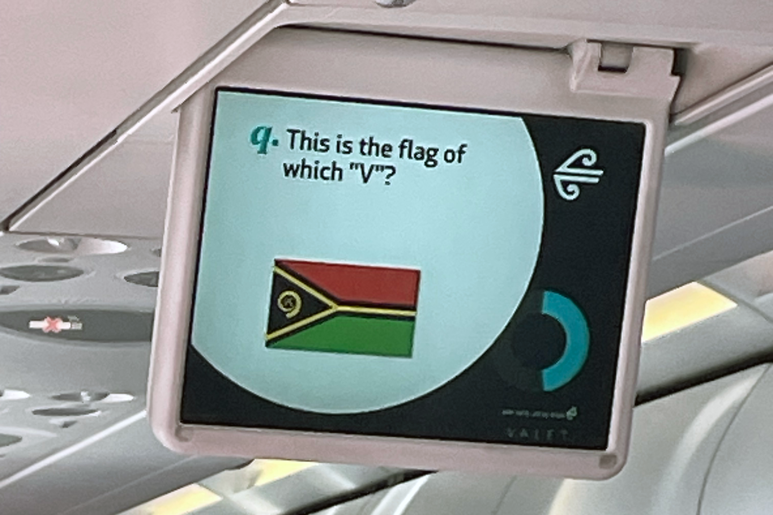 スクリーンが離陸のために折りたたまれている間、私たちがクルージングの高度に到達した後、それらは再配置されました。乗組員は、フライト中にトリビアゲームをプレイすると述べていました。乗組員とのインタラクティブなものを期待して、驚かされるのか怖がらせるべきかはわかりませんでした。ありがたいことに、トリビアはオーバーヘッドスクリーンに限定されていました。地理、歌手、動物など、トピックの良い組み合わせがありました。しかし、奇妙なお父さんの冗談もありましたが、例は「すべての終わりに常に何が起こるのですか?」以下に答えてください!