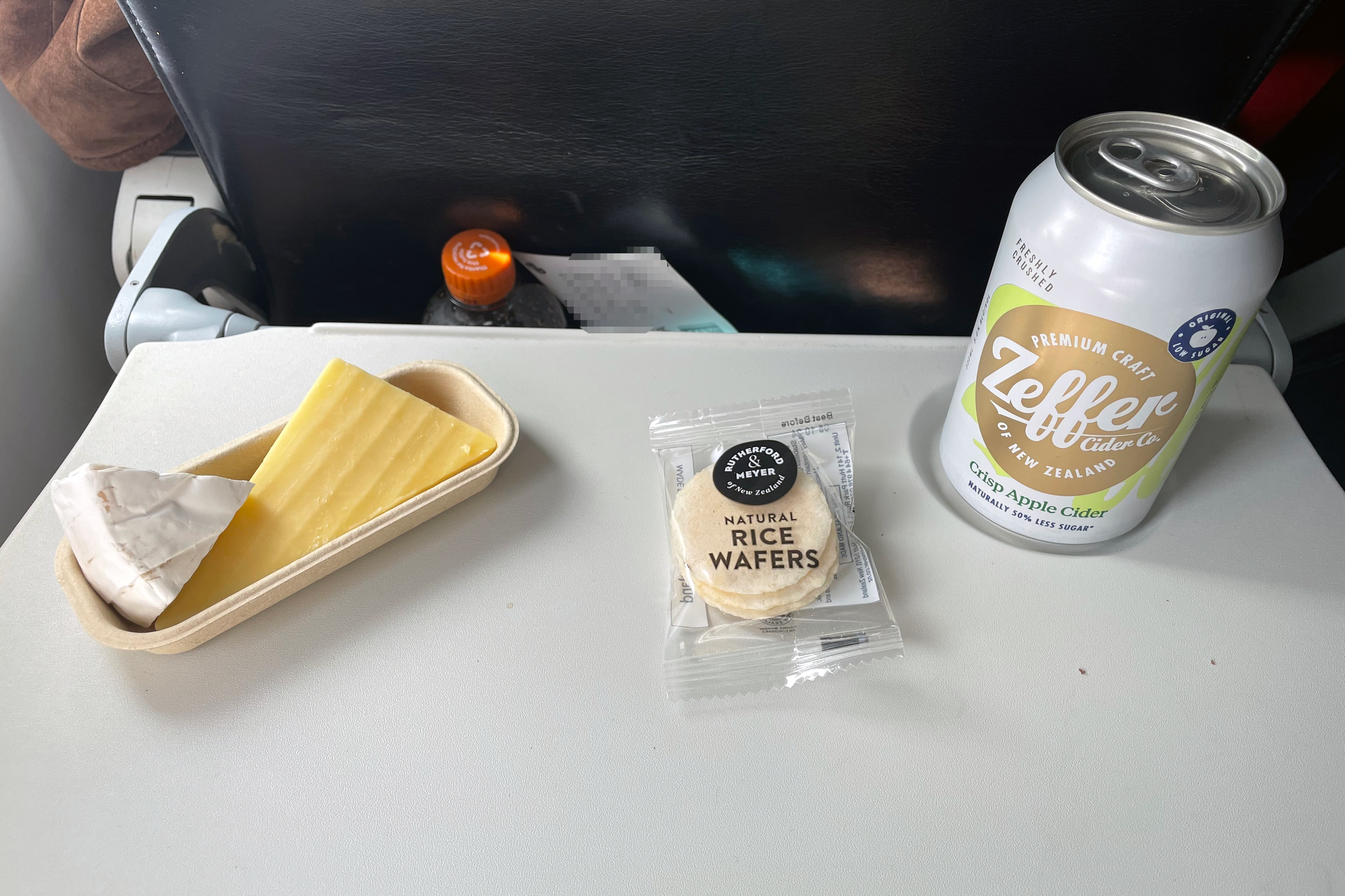 ニュージーランドのサイダーとクラッカーとチーズを選びました。サイダーは、Zephyrによって作られた標準的な醸造でした。味が良かったが、信じられないほど甘かった。食べ物に関しては、クラッカーは家に書くものは何もありませんでした。しかし、チーズは素晴らしかった(もっともっといいのに!)少量のブリーには、チェダーのようなチーズのより大きなスライスが添えられていました。降下が始まる前に、乗組員はまた、吸うボンボンのバスケットを持って来ました。私は赤いものに行きました、それはとても美味しかったです。また、妻の緑のもの(おそらくキウイ風味?)を持っていましたが、それほど良くありませんでした。