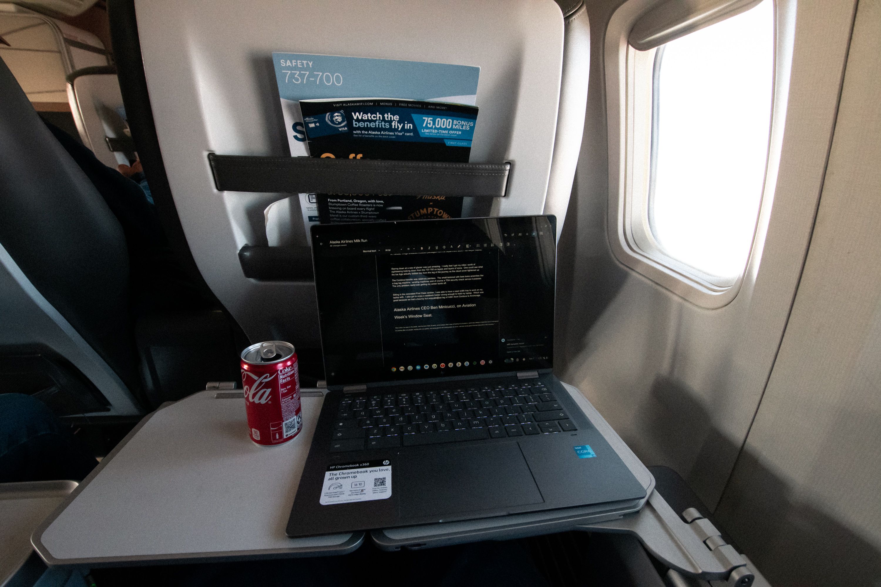 改装されたファーストクラスのセクションに座って、ラップトップで作業するシート幅トレイを用意することができました。また、ラップトップを保持するのに十分な強さのシートバックホルダーを楽しみました。これは、雲の上に登ったコルドバからアンカレッジまで、AS61の弾力がありますが楽しい最後の脚があったので良かったです。以下を見ることができます。トレイを使用して、最初の印象を入力し、無料のコカコーラを飲むことができました。