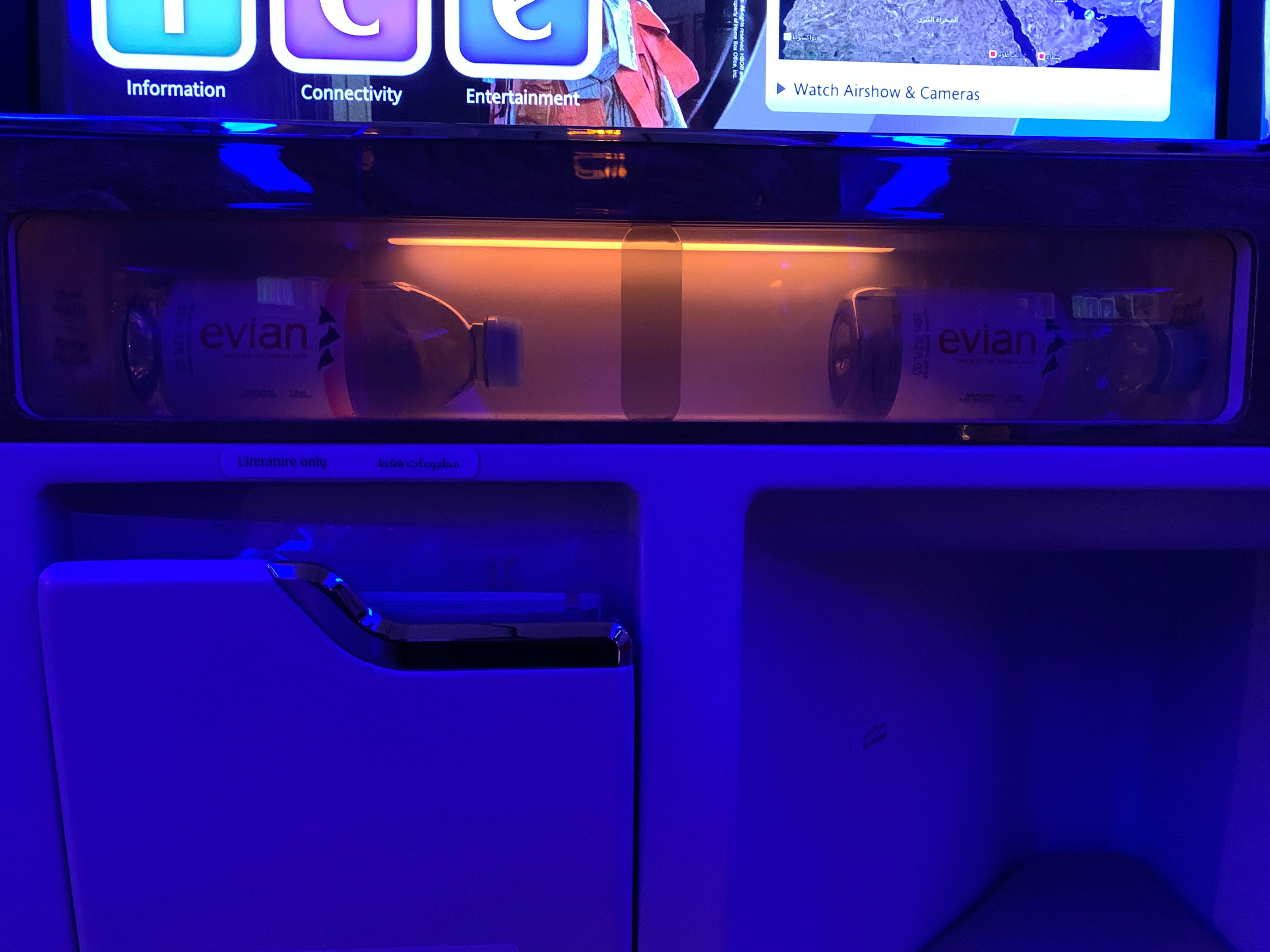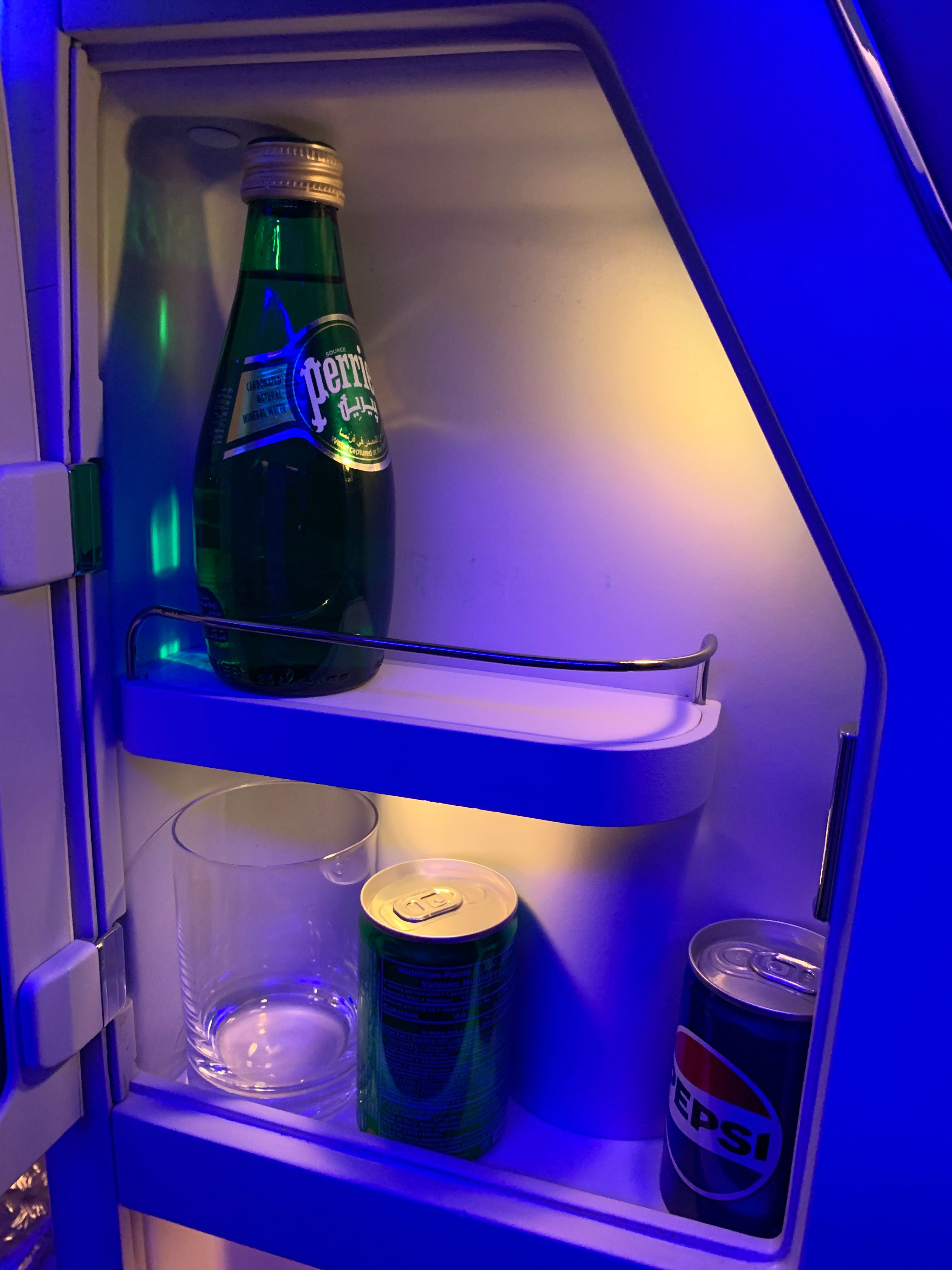 新しいキャビンの大きな変更点は、各座席にパーソナル ミニバーが設置され、ガラス カップ 1 個、エビアン ウォーターボトル 2 本、ペリエ 1 本、ソフトドリンク 2 缶が備え付けられていることです。これは、同社の A380 のビジネスクラスシートにすでに搭載されている機能です。しかし、最も大きな変化はシートの外観です。新しいデザインにより、シートとその周囲の雰囲気はより洗練され、より快適で、より豪華に見えます。