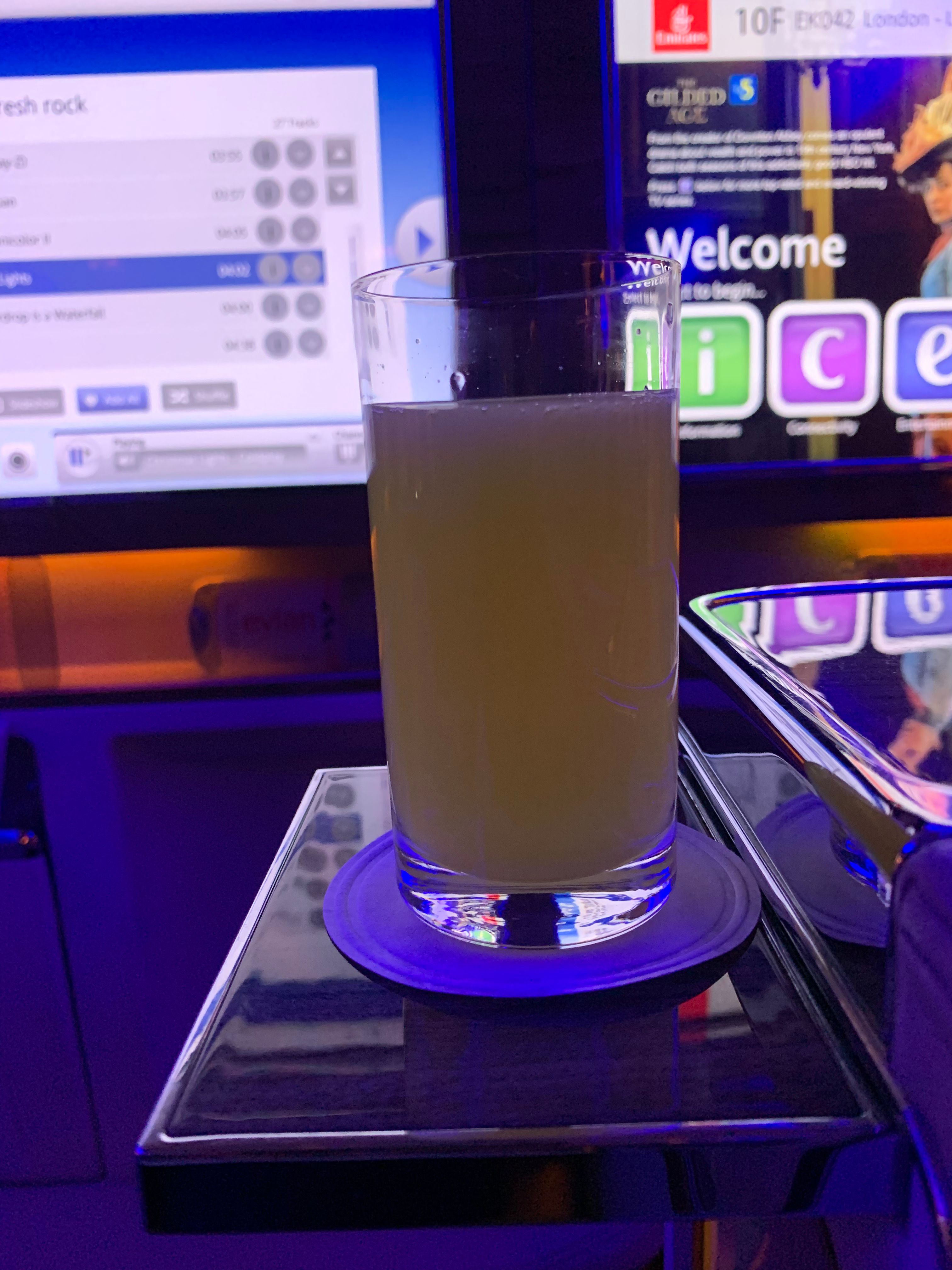 座席に落ち着くとすぐに、シャンパン、絞りたてのリンゴ、オレンジジュースからなる出発前の飲み物の選択肢を提供されました。私の場合は、リンゴジュースを一杯飲みましたが、リクエストに応じてオレンジジュースも一杯出されました。