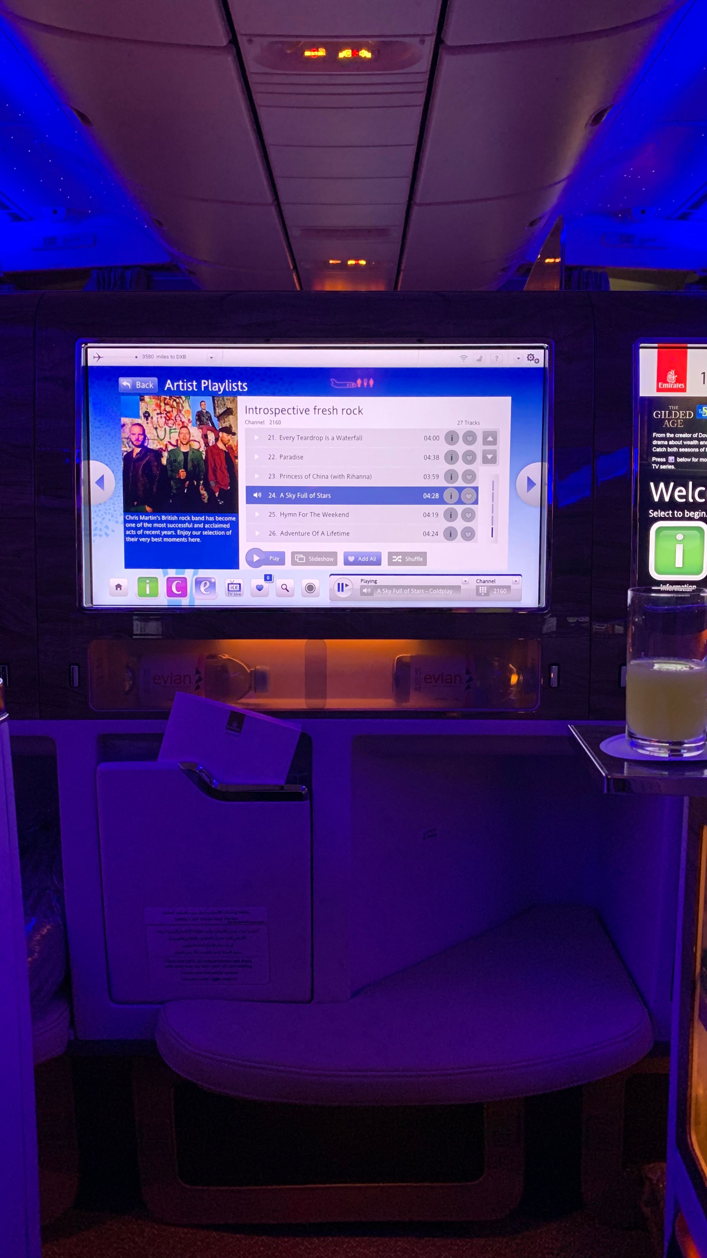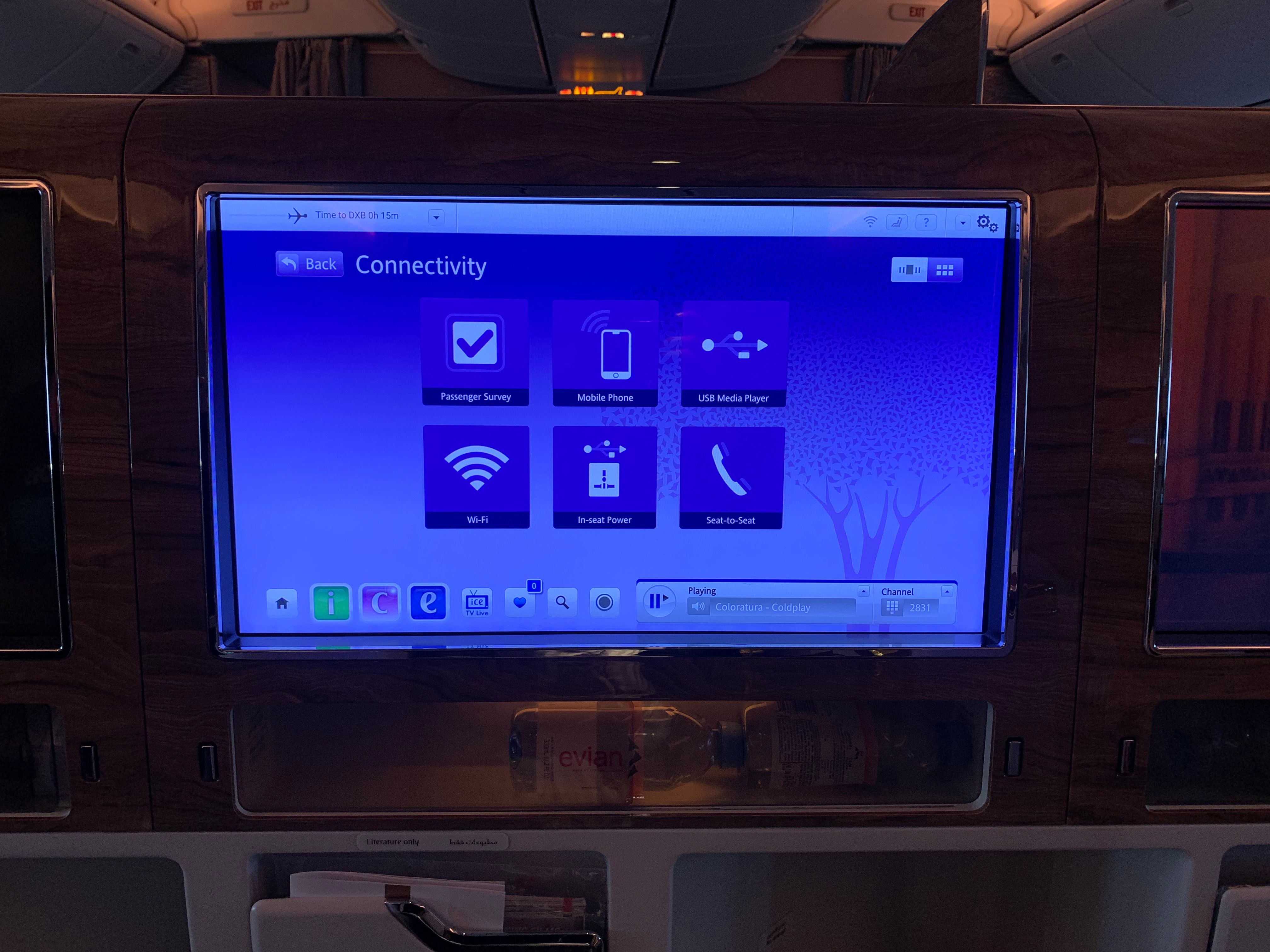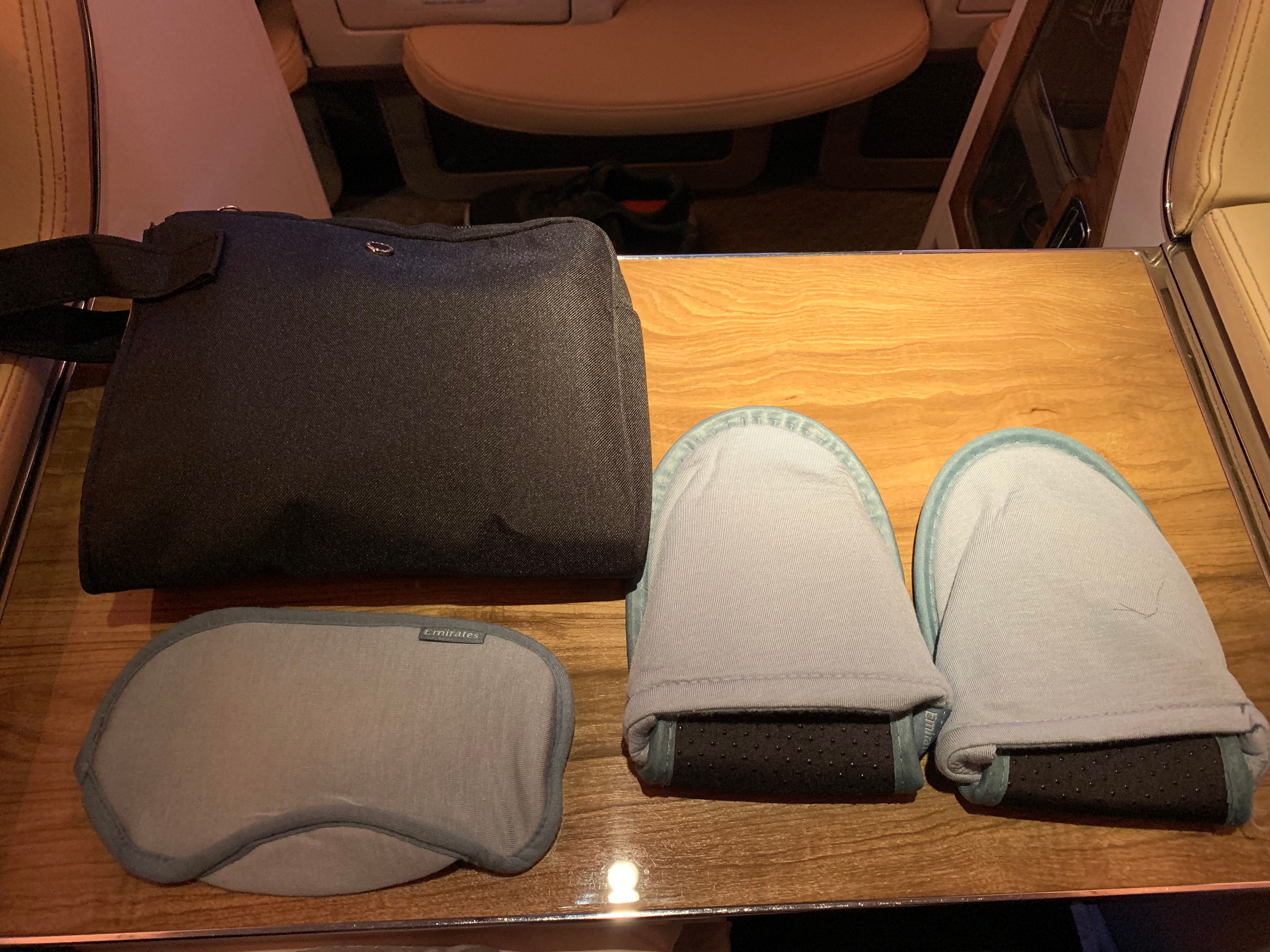 エミレーツ航空の頻繁な利用者として、乗務員はすでに乗客の詳細をシステムに登録していたので、紹介の際に私は名前で挨拶されました。また、座席とその機能の見学を希望するかどうかも尋ねられましたが、私の場合はその必要はありませんでした。その後すぐに、香りの良いホットタオル、アメニティキット、メニュー、ワインリストが届きました。