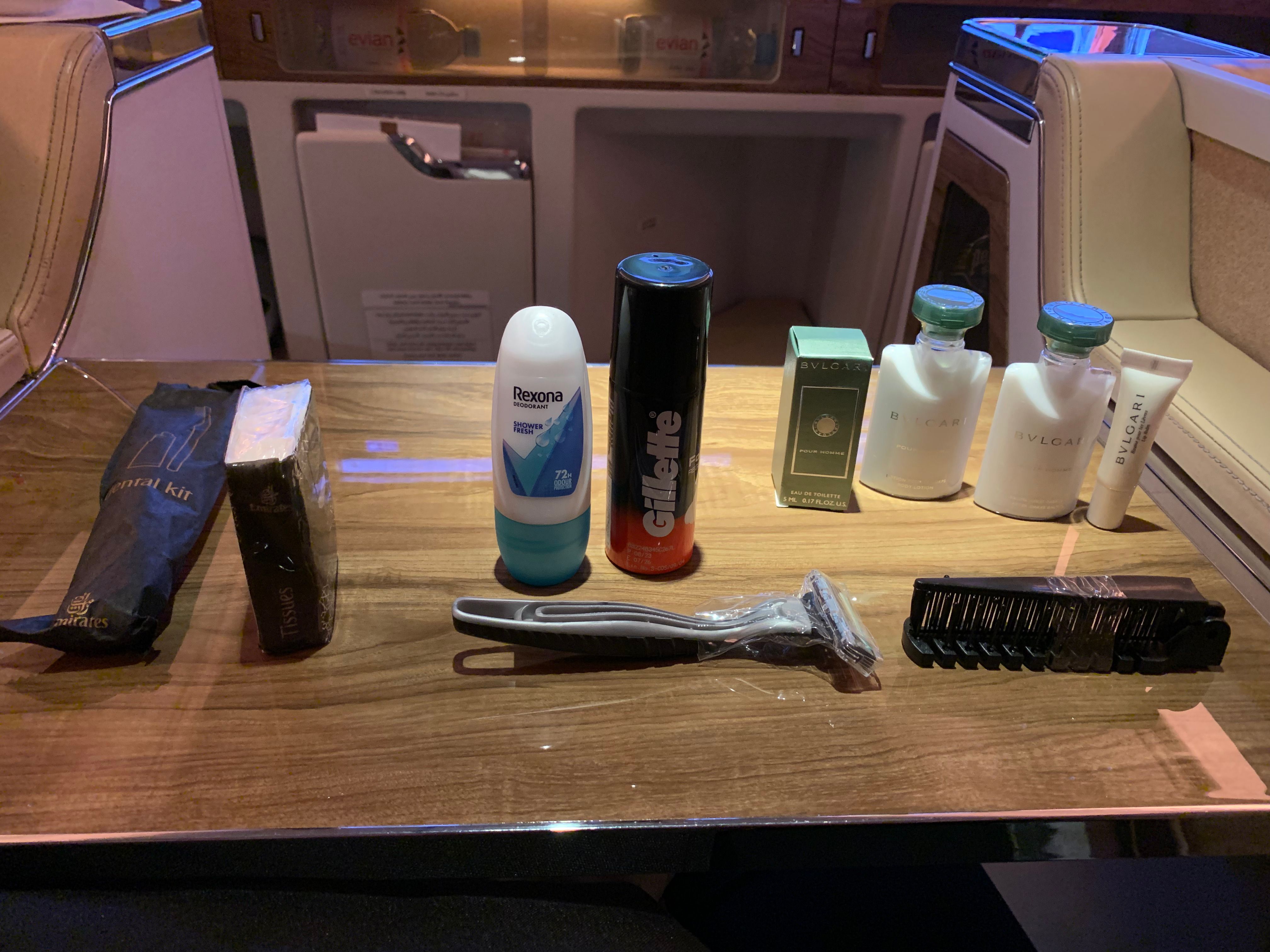 キットの中には、夜間の飛行に役立つ便利な製品がたくさん含まれています。キットにはエミレーツ専用に作られたブルガリ オードトワレ、ボディローション、アフターシェーブバーム、リップバームが含まれています。さらに、ロールオン デオドラント、シェービング フォーム、シェービング ブレード、ヘアコーム、デンタル キット、フェイシャル ティッシュ パックも見つかります。