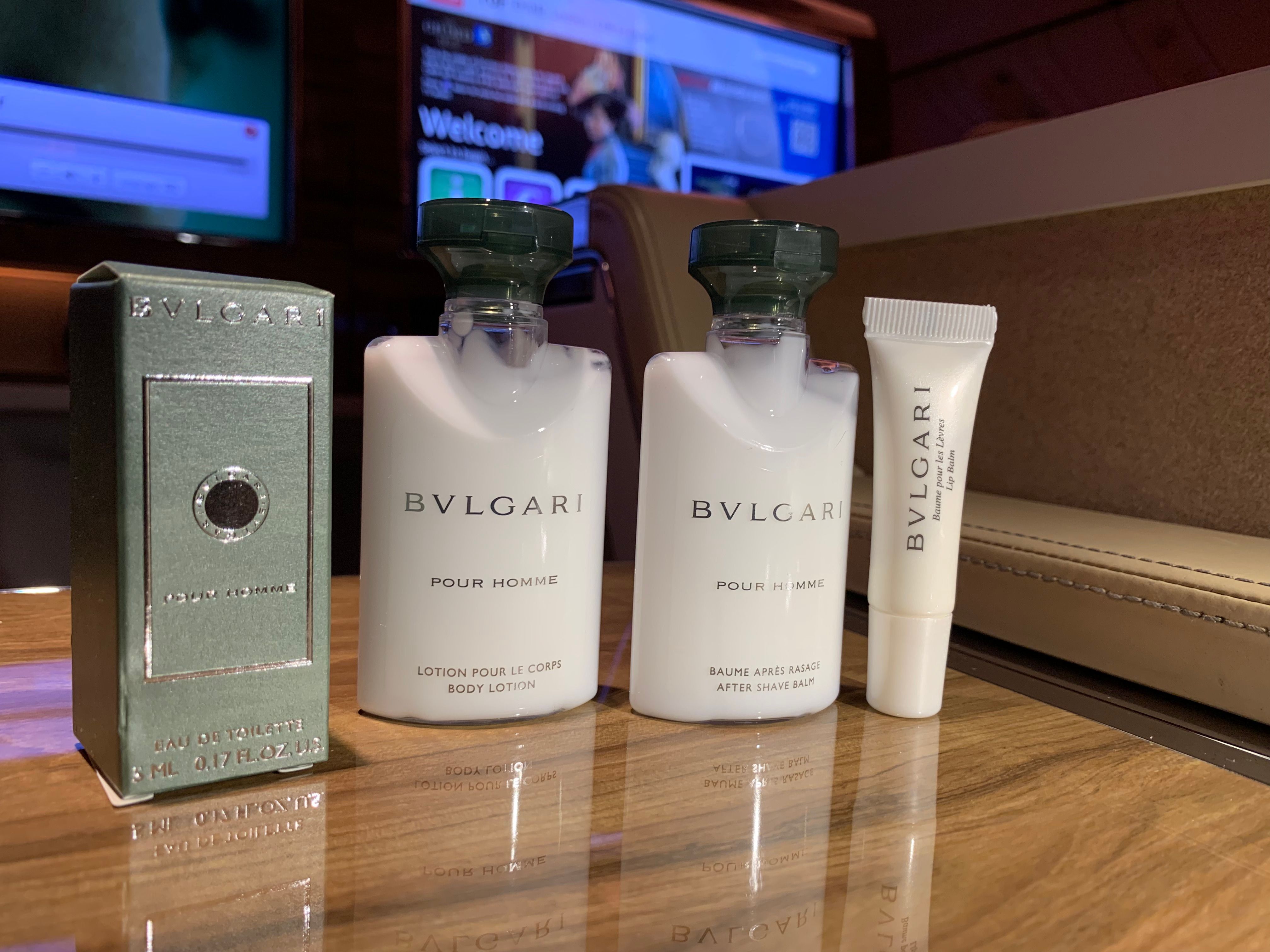 エミレーツ航空は、ビジネスクラスとファーストクラスの乗客に提供するアメニティキットに関して、高級ブランドのブルガリと長年提携してきました。キットはエミレーツ航空の乗客専用に作られた新しいブルガリの香りで常に更新されます。