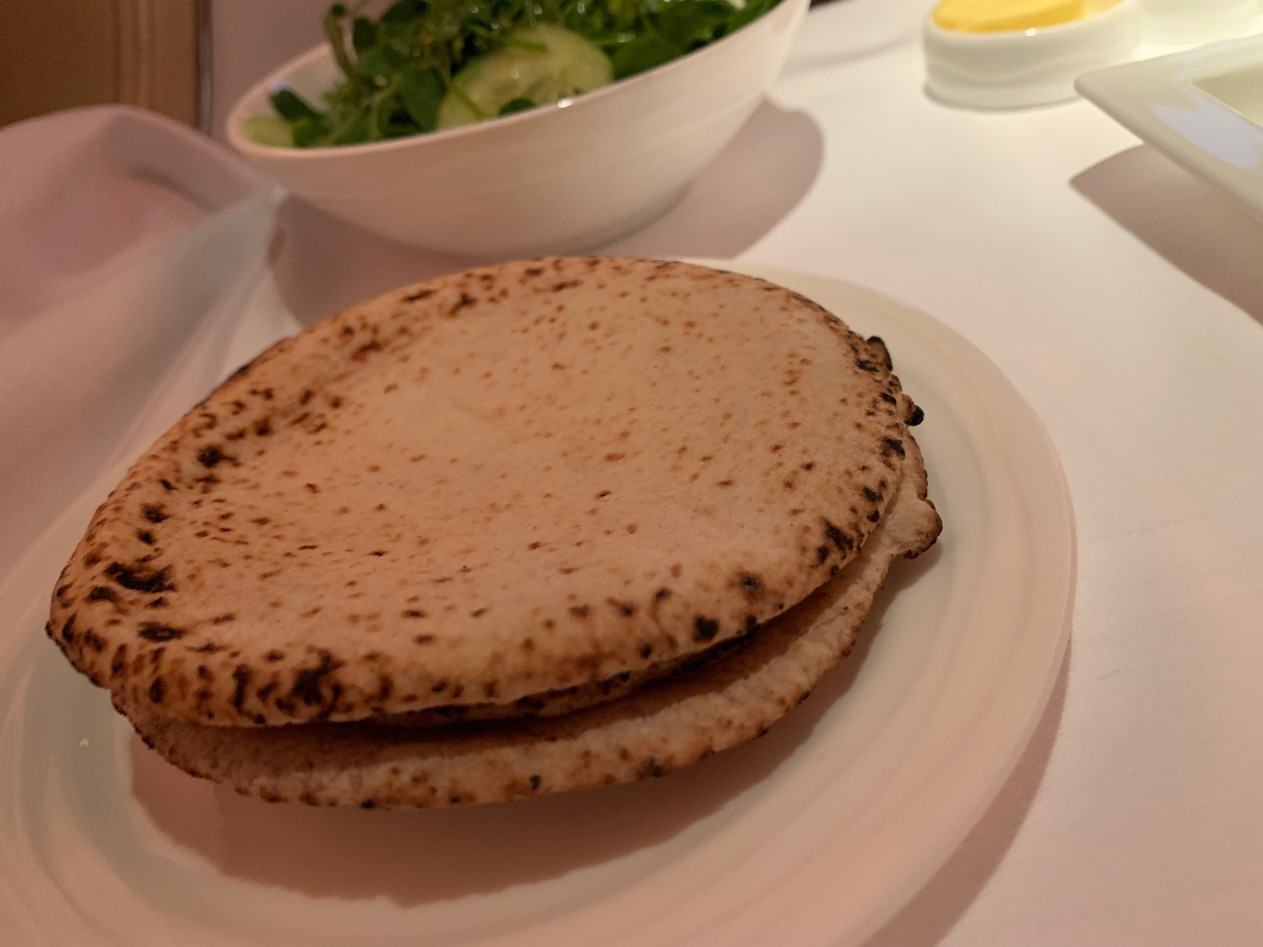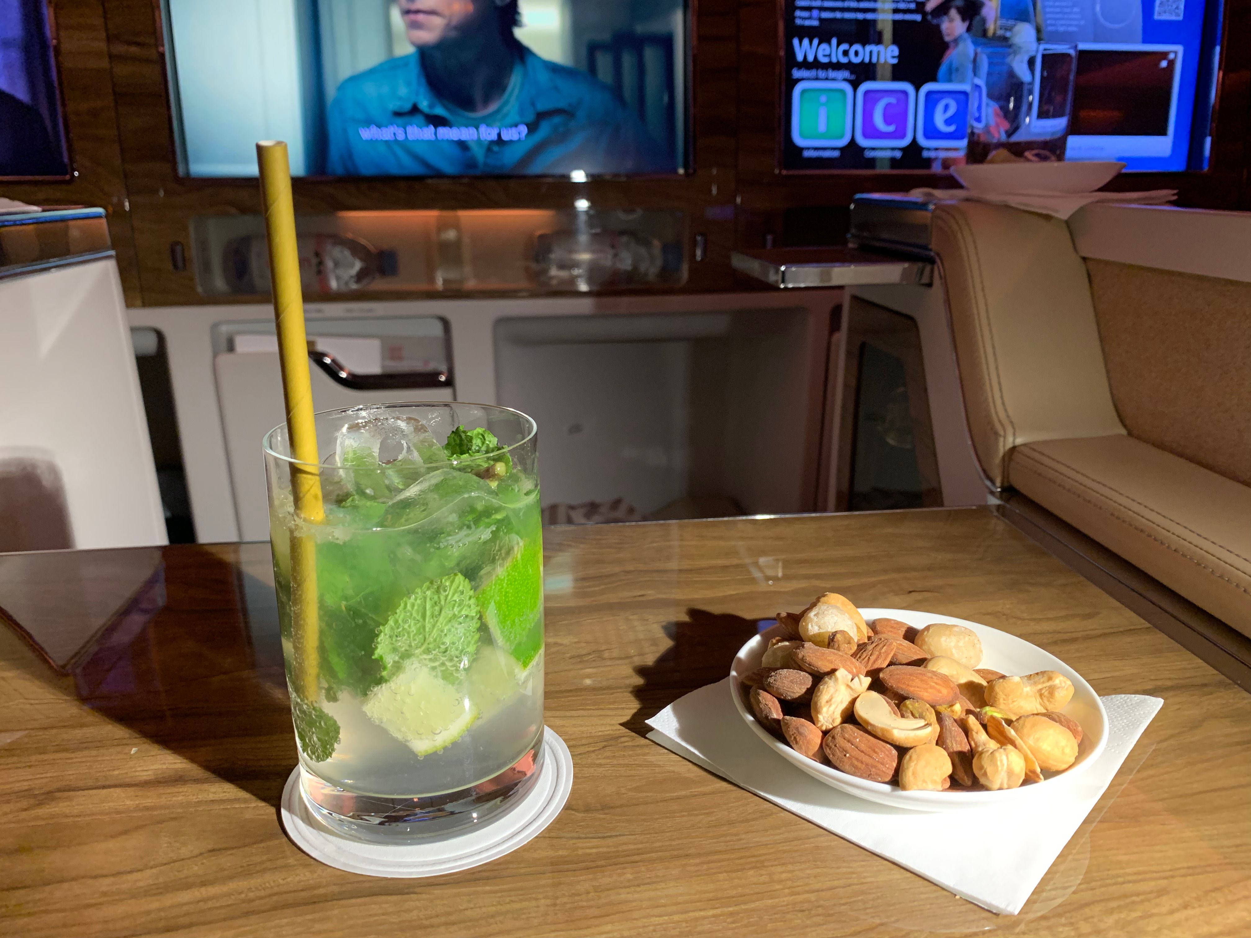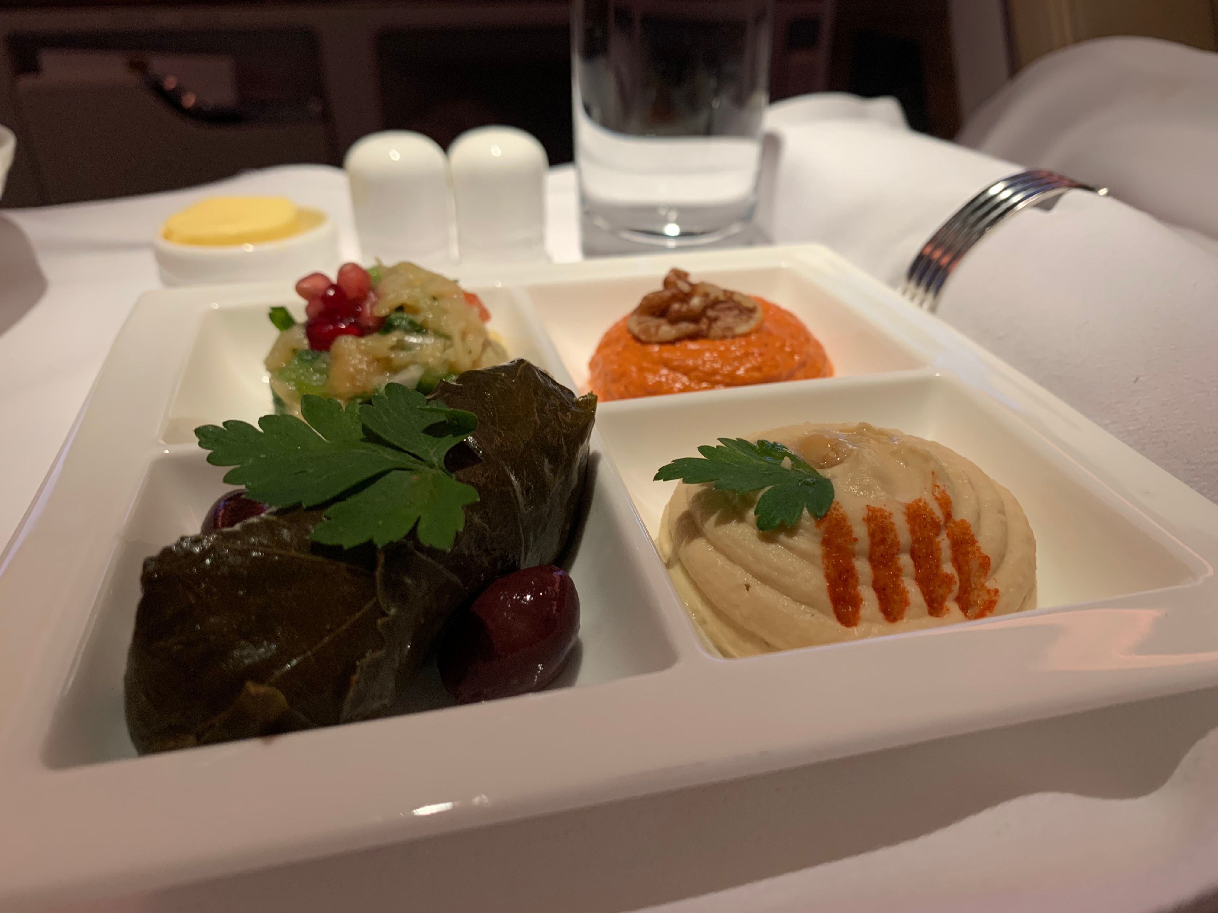離陸後のドリンクはバージンモヒートとミックスナッツをいただきました。 3コースのディナーでは、前菜に伝統的なアラビアのメッゼ、メインコースに牛フィレ肉のたたき、デザートにホワイトチョコレートチーズケーキを選びました。ディナーには新鮮なサラダと温かいパン各種が付いています。