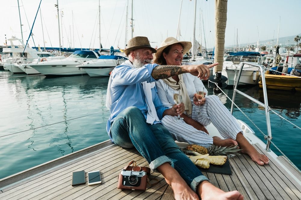 夏休み中にフロリダのヨットでシャンパンを飲む上級カップル