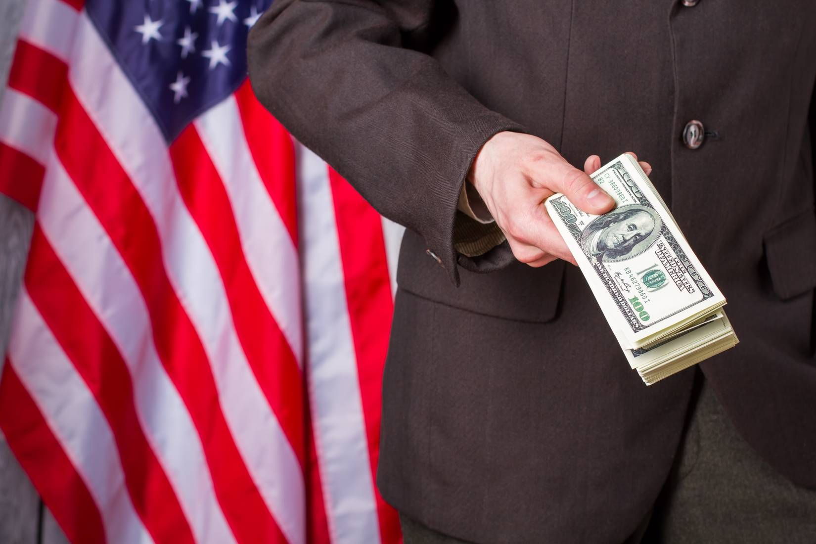米国旗の横にドルを保持しているビジネスマンクレジット: Shutterstock