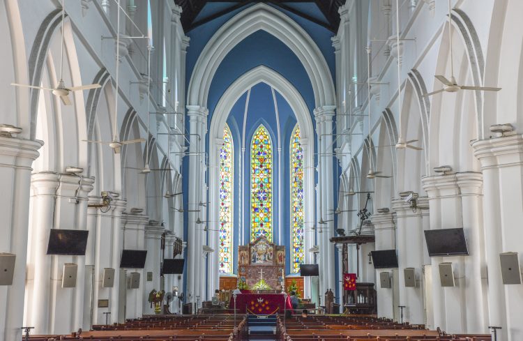 ステンドグラスのデザインの熱心なファンとして、私はシンガポール最大の大聖堂であるセント アンドリュース大聖堂の内部に魅了されました。シンガポールの太陽は猛烈で、その光がこのゴシック様式の大聖堂の複雑な装飾が施されたガラス窓を通って輝くと、私は明るい色のパレットを浴びました。