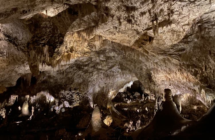 カールスバッドの洞窟はですかなりアクセスしやすいエレベーター75のストーリーを「ビッグルーム」まで持ち込むことができるので、洞窟の多くはほとんどフラットトレイルとボードウォークを介して見ることができます。私は自然な入り口のトレイルを1.25mi(2km)ハイキングすることを選択しました。 1時間のハイキング中に、私は他の2人に遭遇しました(さらに、地質学を少し説明したパークレンジャー)。大きな部屋に着くと、私は地面から撃ち、天井から滴り落ちるstal乳石が洞窟の周りに散らばっている小さなプールから散らばっている数千人の石lagが囲まれていました。ハイキングしてバックアップしたり、エレベーターに乗ったりすることができます。洞窟(公園のメインドロー)は屋外ではないため、公園は容量を制限するためにタイミングのある入場チケットを要求していることに注意してください。
