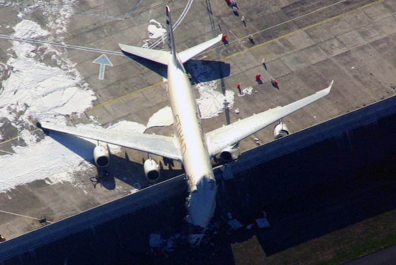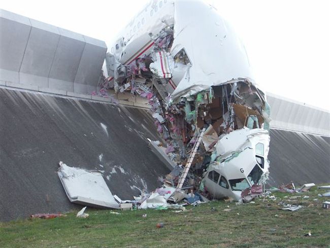 クアッドジェットは約30度の角度でコンクリートバリアに衝突した。画像で見られるように、前部客室の下側は約 49.2 フィート (15 メートル) 引き裂かれ、壁を突き破る際に下方に曲がっていました。コックピットは壁の向こう側の地面に激突した。さらに、機体左側の第1エンジンと第2エンジンが壁に接触し大破した。