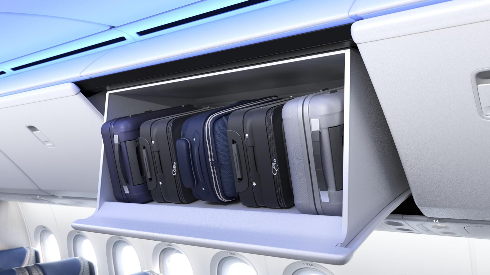 ボーイング社の客室モックアップによると、ビジネスインサイダー、各頭上の棚には、コンパートメントごとに標準的なローラーバッグを最大 4 つまで収納でき、以前の 777 モデルのおよそ 2 倍の容量になります。さらに、ボーイング社は、ゴミ箱を閉める力が 40% 軽減され、あらゆる身長の乗客が力を入れたり、客室乗務員の助けを必要とせずにゴミ箱を閉めることが容易になったと述べています。