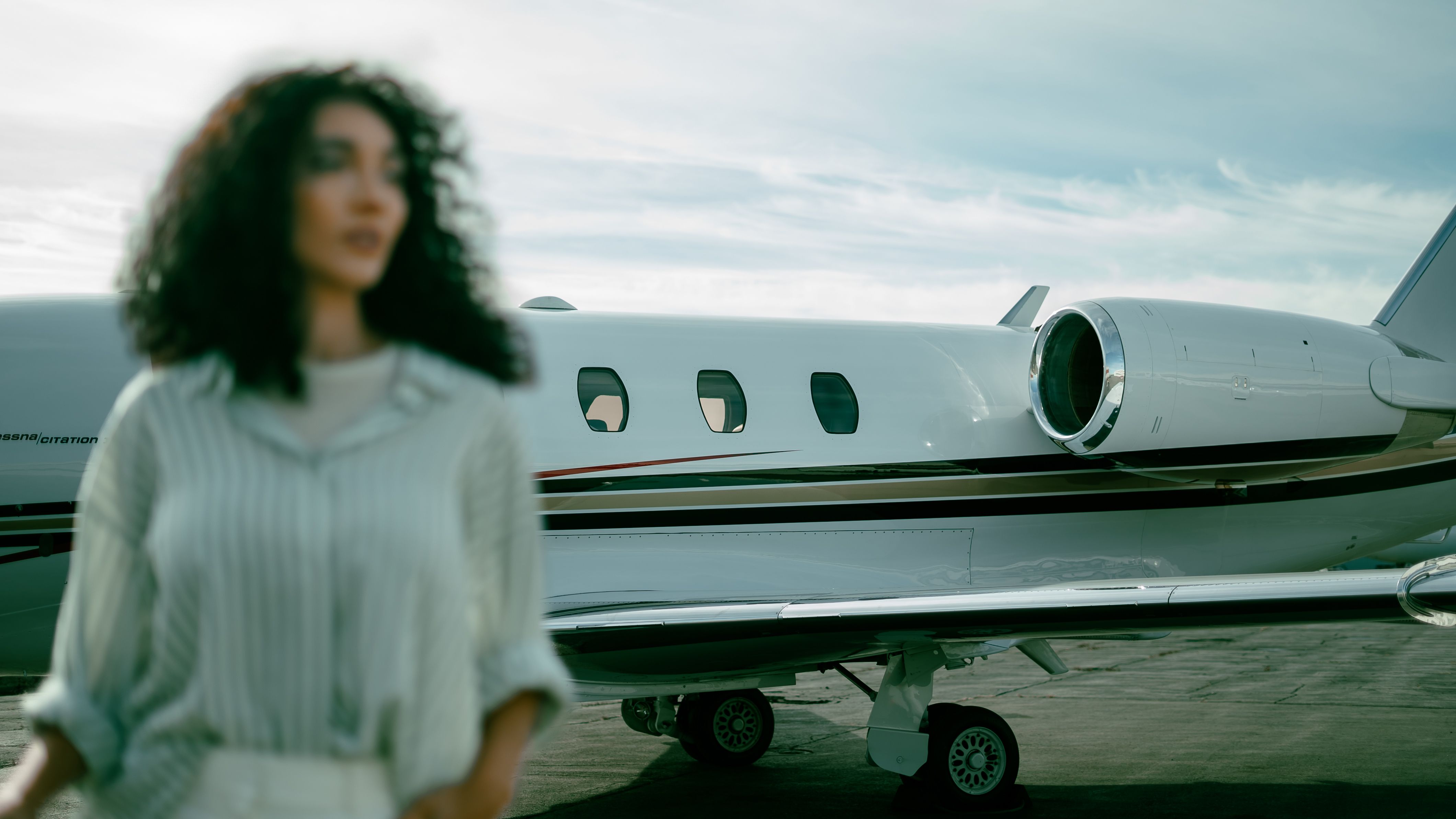 フライグリーン社のプライベートチャータージェット機の前に立つ顧客