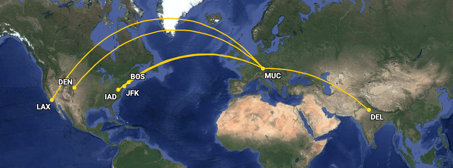 ドイツの航空会社は、A380 をミュンヘンから独占的に配備しています。今後のシーズン中にこのタイプが運航する6つの目的地のうち5つは米国行きです。もう一つはデリー・インディラ・ガンディー国際空港です。下の地図は、同社が6月に計画しているA380の路線網を示している。