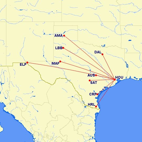 同社はヒューストンからミッドランド・オデッサ地域にサービスを提供するミッドランド国際航空宇宙港(MAF)にもサービスを提供しており、平均1日3便以上の便を運航しています。同社はまた、ヒューストン発ハーリンジェンズバレー国際空港(HRL)行きの直行便を1日3便以上運航しており、1月には合計100便が運航されている。ヒューストン発の直行便のうち最も混雑している便はダラスとサンアントニオ行きで、どちらも 1 日 7 便以上運航されています。