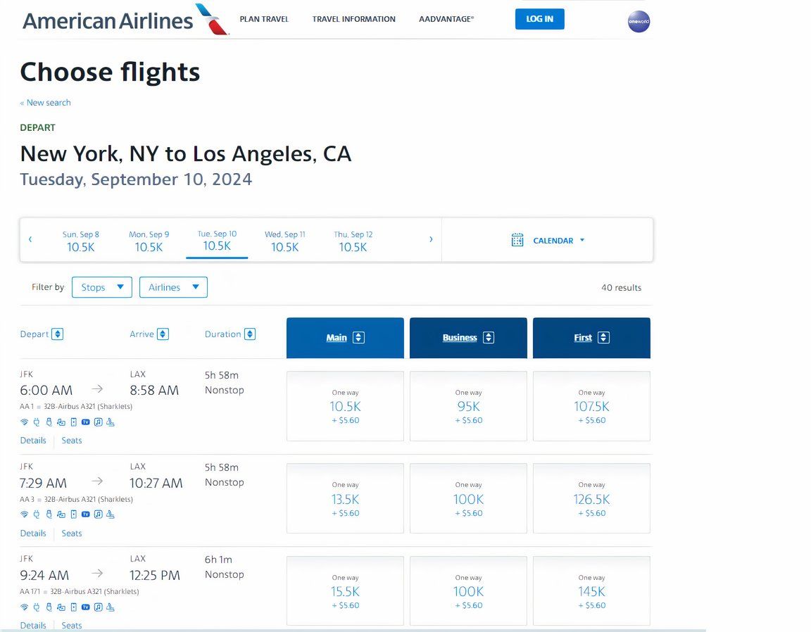 例として、American Airlines AAdvantage でのマイル交換を考えてみましょう。下の画像に示すように、ニューヨーク JFK とロサンゼルス LAX 間の片道航空券を約 3 か月前に簡単に検索すると、次の料金が得られます。