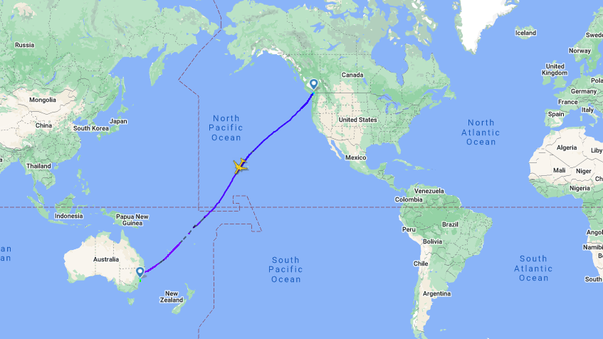 8月、最長のカナダ777-200LRルートは、バンクーバー(YVR)からオーストラリアのシドニー(SYD)までです。ルートは7,755マイル(12,480 km)で、15時間40分のフライト時間が予定されていますが、Flightradar24はほとんどのフライトが15時間弱で目的地に到達することを示しています。