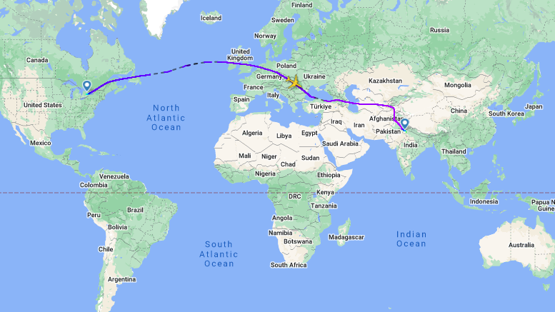 YVR – SYDルートと同様に、エアカナダはYYZとDelの間の各方向に31便(1日1回)を提供します。トロントからのフライトは、19:45頃の夕方に出発し、デリーへのフライトは22:50頃に出発します。