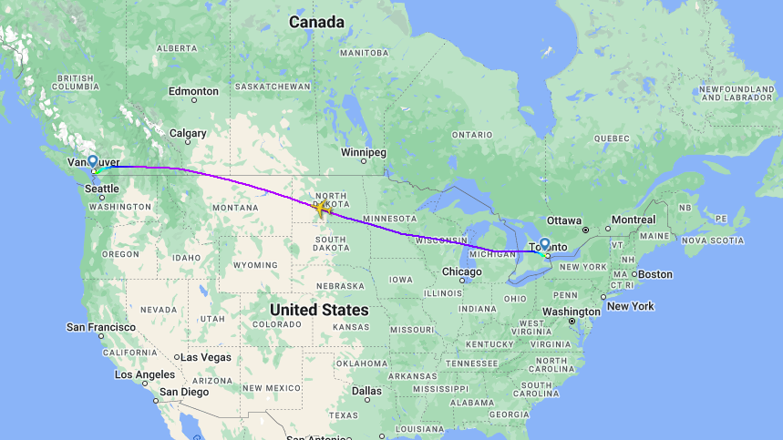 8月のエアカナダの777-200LRSの5番目と最短ルートは、国内便です。トロント(YYZ)からバンクーバー(YVR)までの航空会社のルートは、片道2,085マイル(3,355 km)です。 YYZ – YVRフライトの予定された飛行時間は4時間56分ですが、ほとんどのフライトはわずか4時間で目的地に到着します。