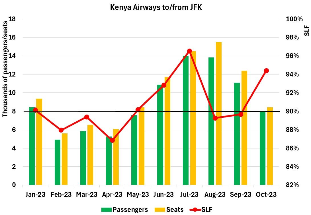 米国運輸省のデータによると、ケニア航空は2023年1月から利用可能な最後の月である10月までの間、JFK空港往復で約9万人の乗客を運んだ。月ごとの金額を以下に示します。平均座席搭乗率は 91% であり、これ自体は非常に健全です。ただし、これを単独で考慮すべきではなく、常にそれがどのように達成されたかについて考慮する必要があります。