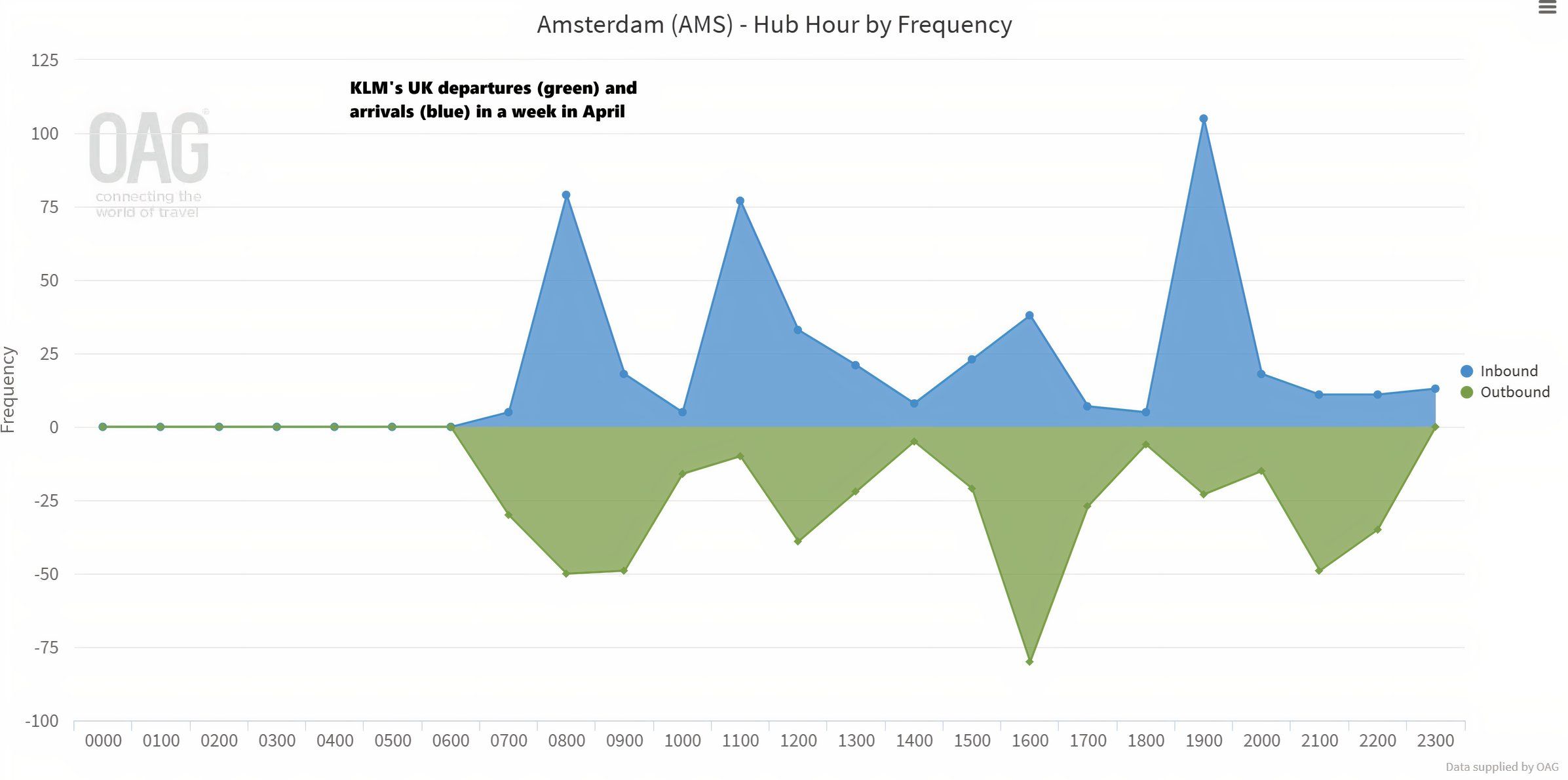 2025 年に、KLM は典型的な毎日66英国への離陸便(往復で 2 倍)があり、半分の日は本数が少なく、残りの半日は本数が多くなります。 OAG データを使用してすべてのフライトを調査すると、今年の最高頻度は次のとおりです。1日71便出発。
