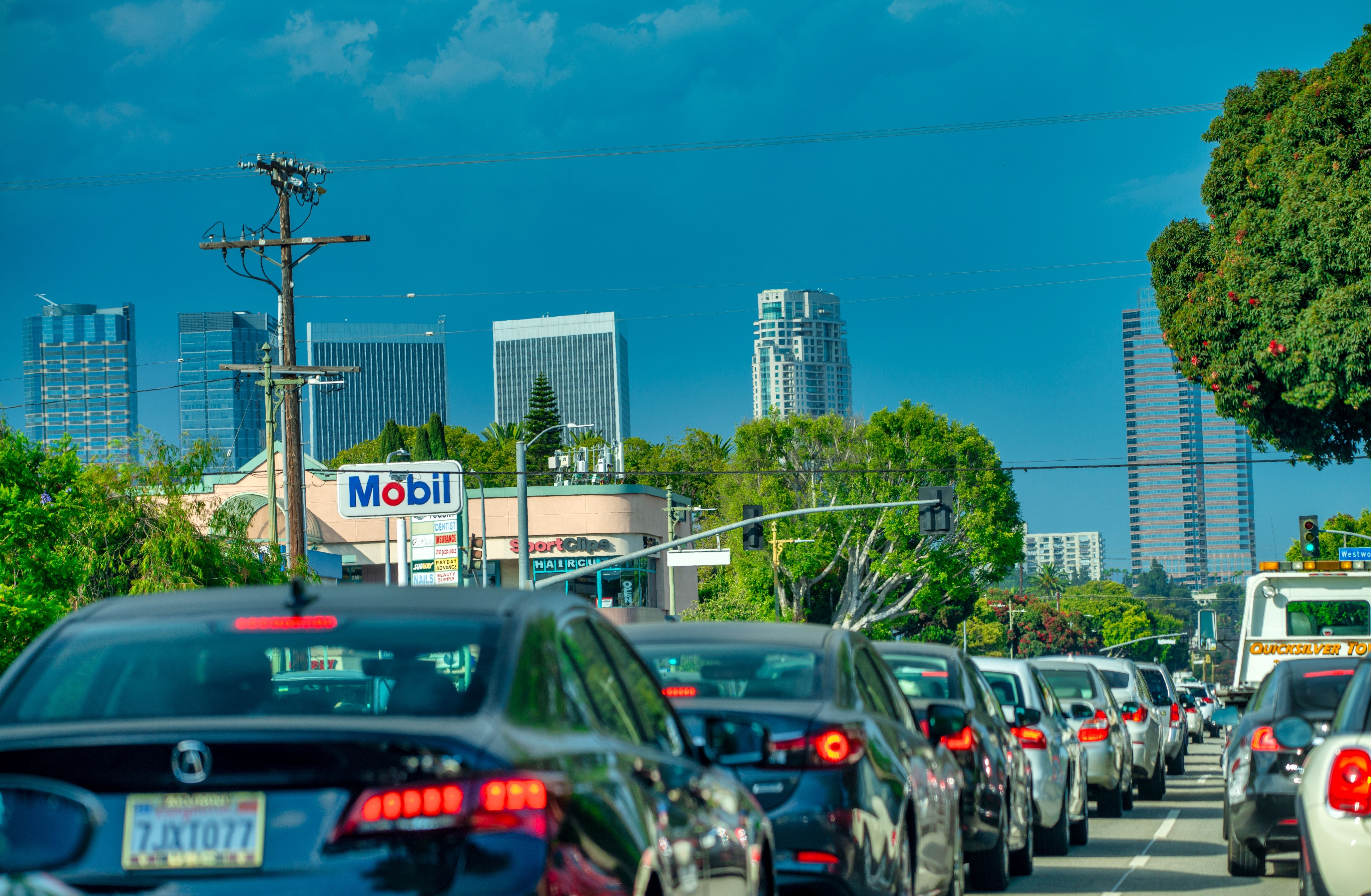 カリフォルニア州ロサンゼルスのビバリーヒルズに向かう道路沿いの交通。