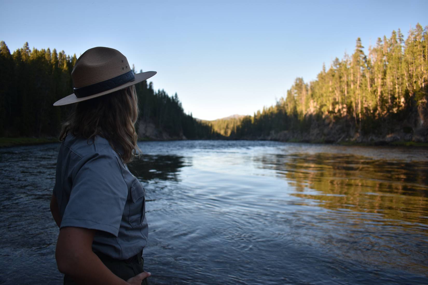 イエローストーン国立公園の水路を見下ろすパークレンジャー クレジット: Shutterstock