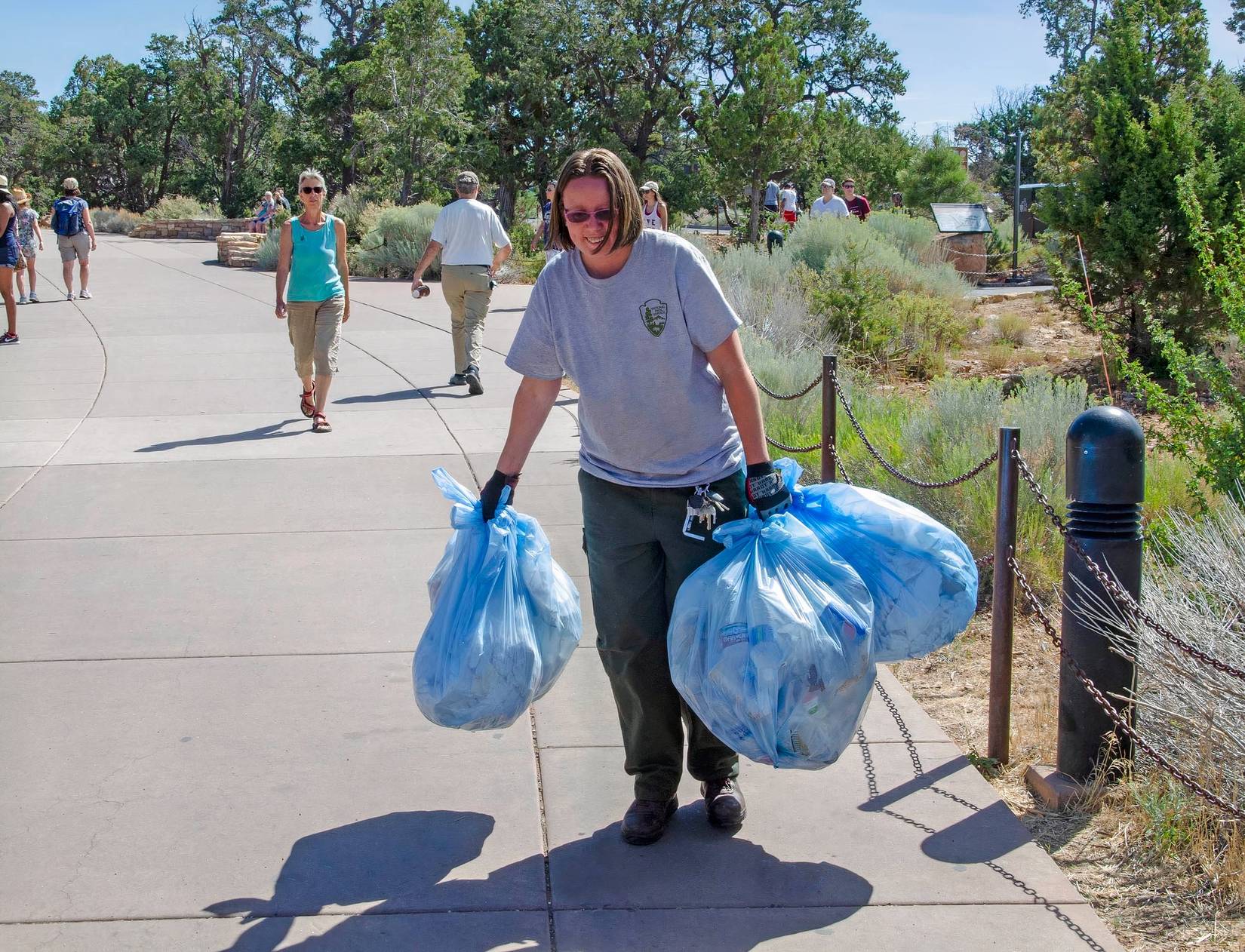パークレンジャーがグランドキャニオン国立公園ビジターセンターでゴミを集めるクレジット: グランドキャニオン国立公園/ウィキメディア・コモンズ