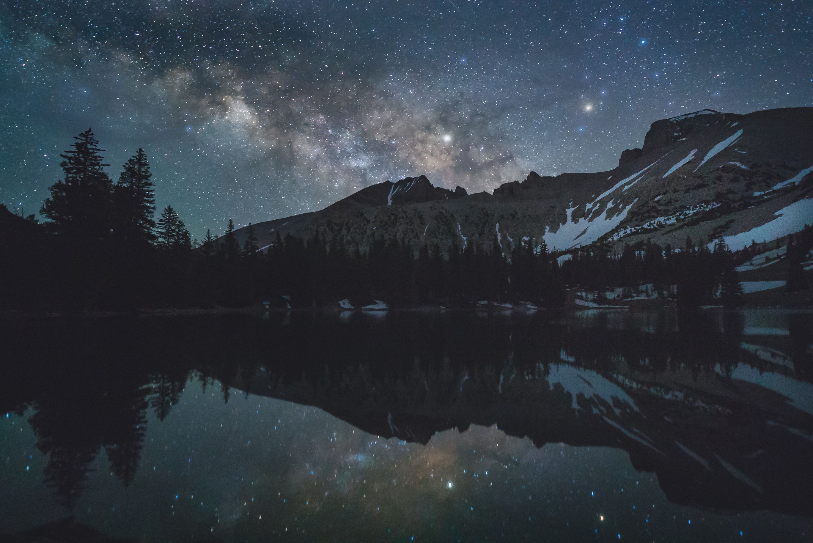 米国ネバダ州ネバダ州の湖に映る、雪山の上に天の川がある、グレートベースン国立公園の高度 11,000 フィートの夜の暗い空の場所。
