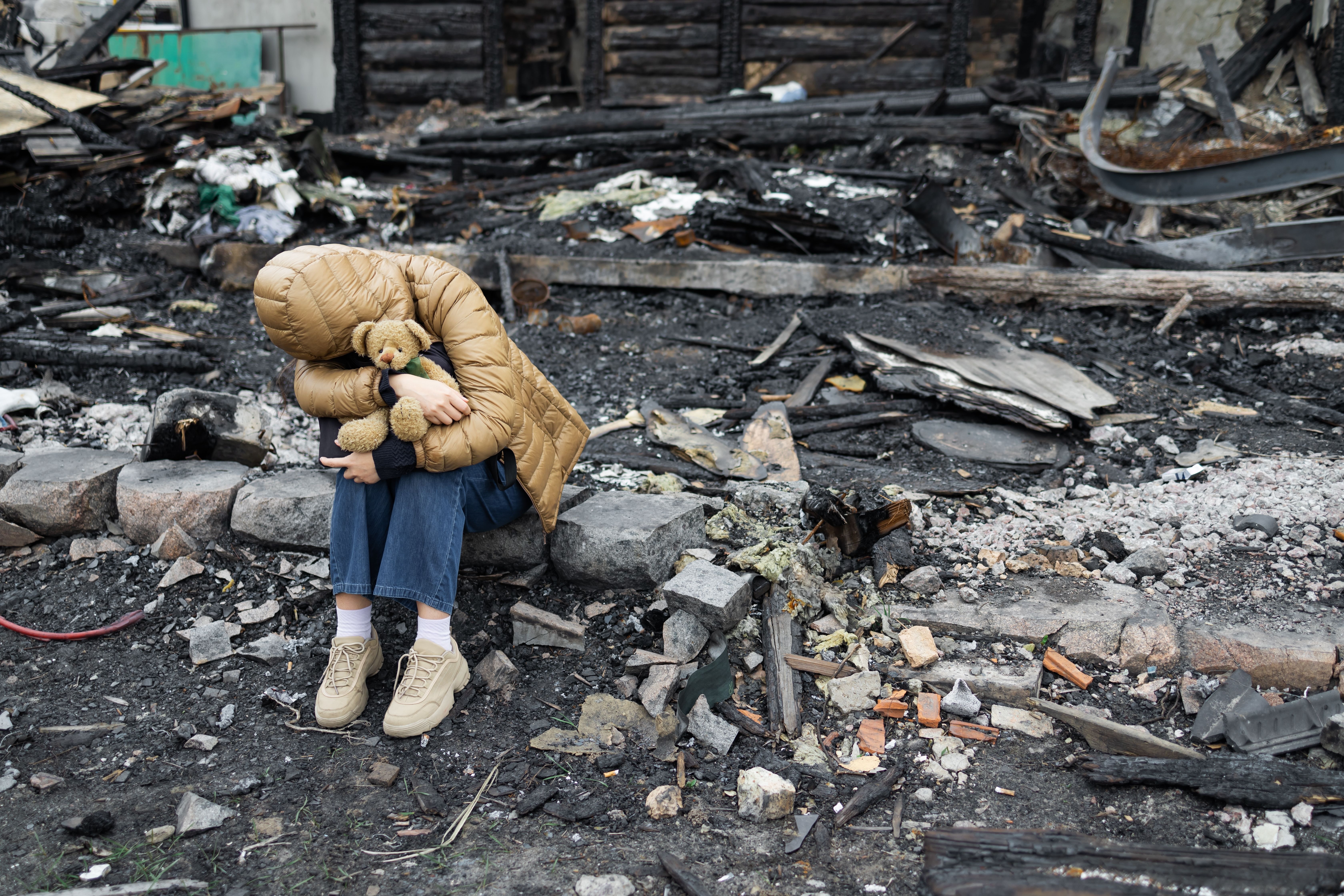 戦争によって破壊された家の隣の女の子。ウクライナでの戦争。ウクライナ難民