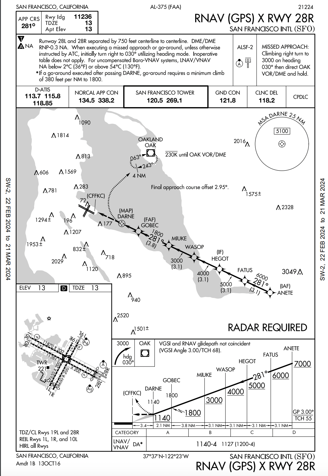 現在、SFO はコントローラーによるオフセットを使用して動作します。滑走路 28R への進入は、古い PRM SOIA 手順で使用されていたものと同様に、左に 3 度オフセットしたものがまだ 1 つあります (RNAV X 28R、下の写真)。進入を逃した地点は 3.4 マイルの最終地点で、滑走路の高さから 1,100 フィート以上上にあり、並行交通との衝突を避けるために垂直方向および横方向の誘導による進入の標準的な GPS 最小値をはるかに上回っていることに注意してください。