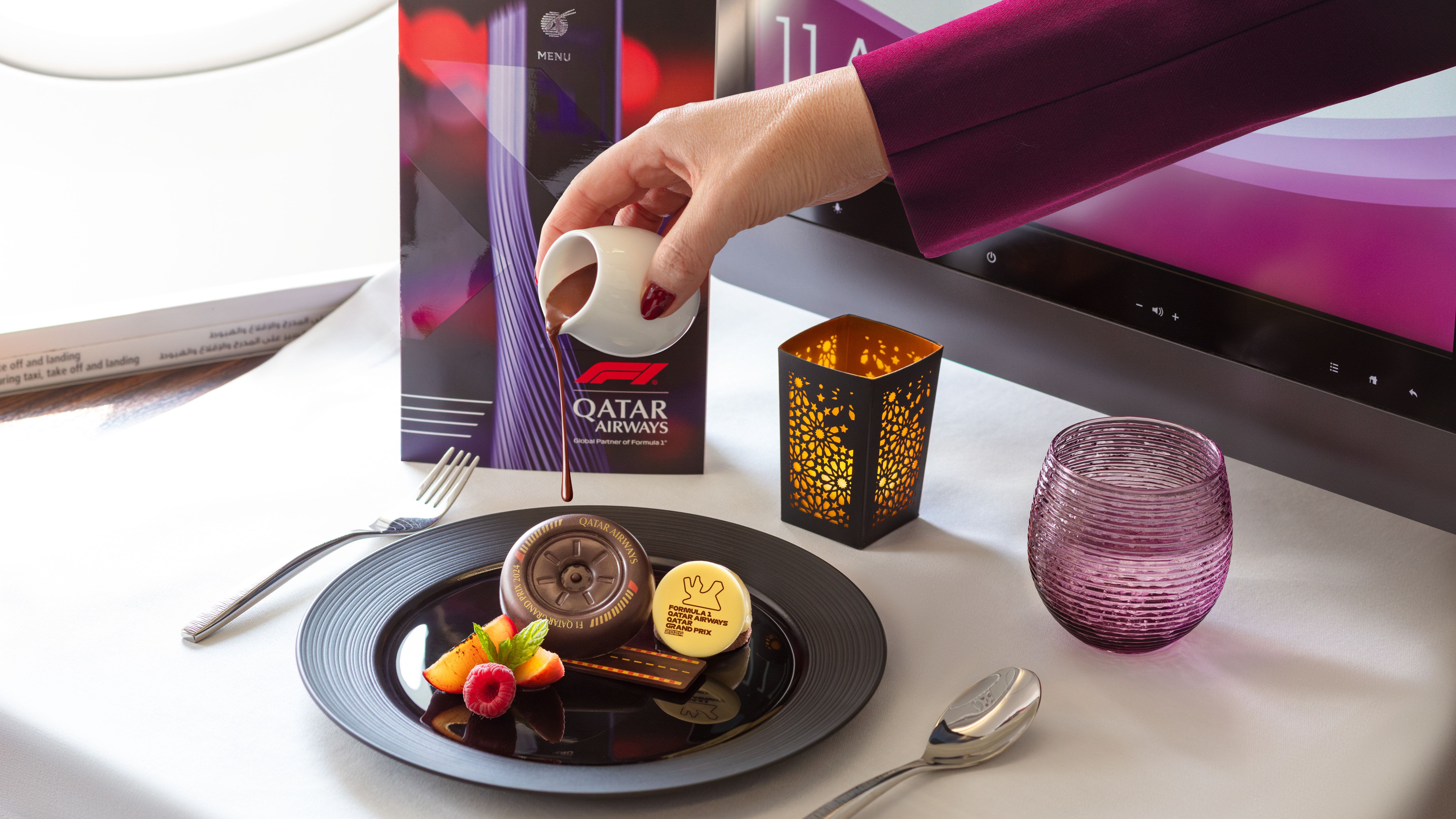 ラウンジウェアとは別に、カタールエアウェイズ(カタール)は、F1をテーマにしたメニューカードでプレミアムダイニングオプションを提供し、F1をテーマにしたデザートとチョコレートを提供し、サービスにいくつかのフォーミュラ1レースの興奮をもたらします。エコノミークラスのダイニングには、特別なカトラリーバンド、トレイマット、F1インスパイアされたチョコレートがスナックとして提供されています。