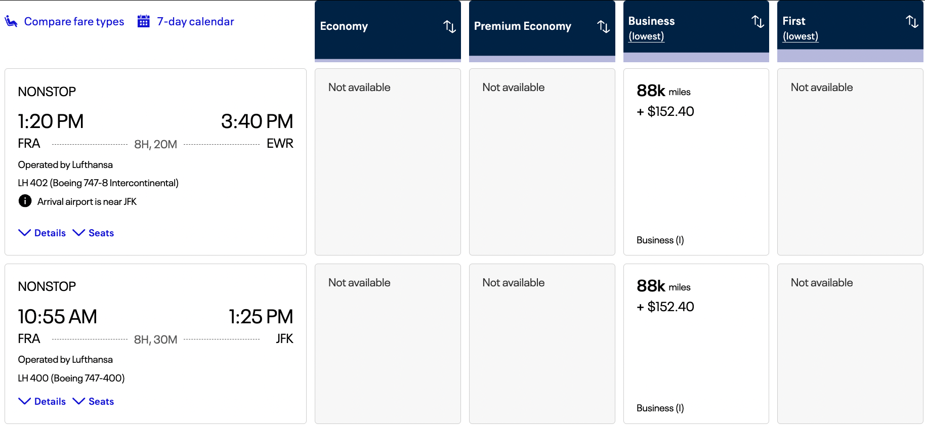 以下のスクリーンショットは、FRA から JFK までのフライトと特典航空券に必要なマイル数を示しています。