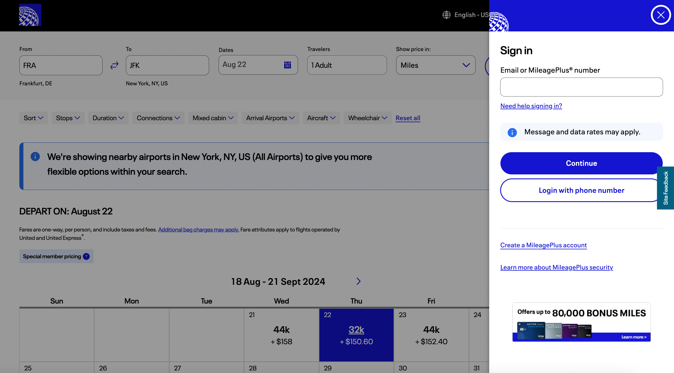 次に、ご希望のフライトをクリックし、ポップアップの指示に従ってユナイテッド マイレージプラス アカウントにログインします。あるいは、フライトの検索を開始する前に、ステップ 1 の前にこれを実行することもできます。