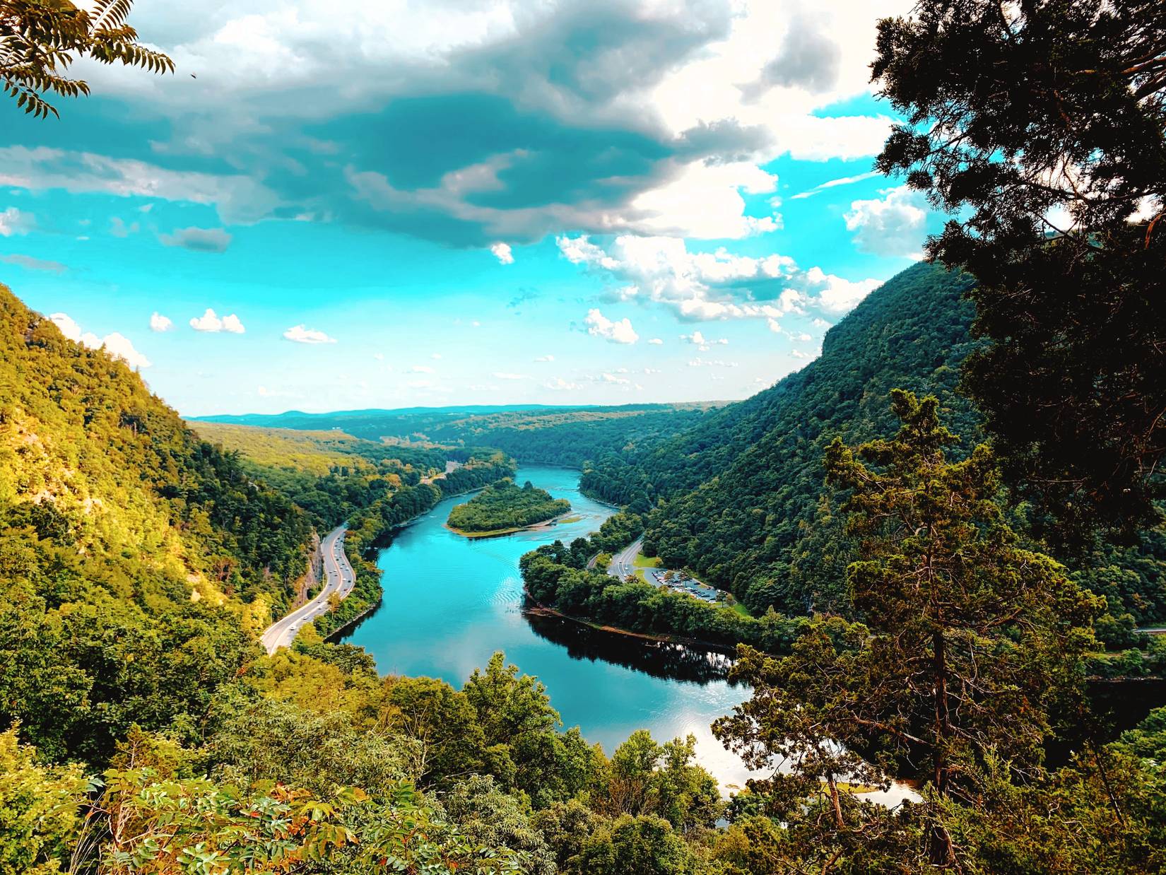 デラウェアウォーターギャップ国立レクリエーションエリアは、ニュージャージー州とペンシルベニア州の国境にある川の広がりに到達します。草が茂ったビーチ、森林に覆われた山々を囲み、キタティニーの尾根をスライスします。