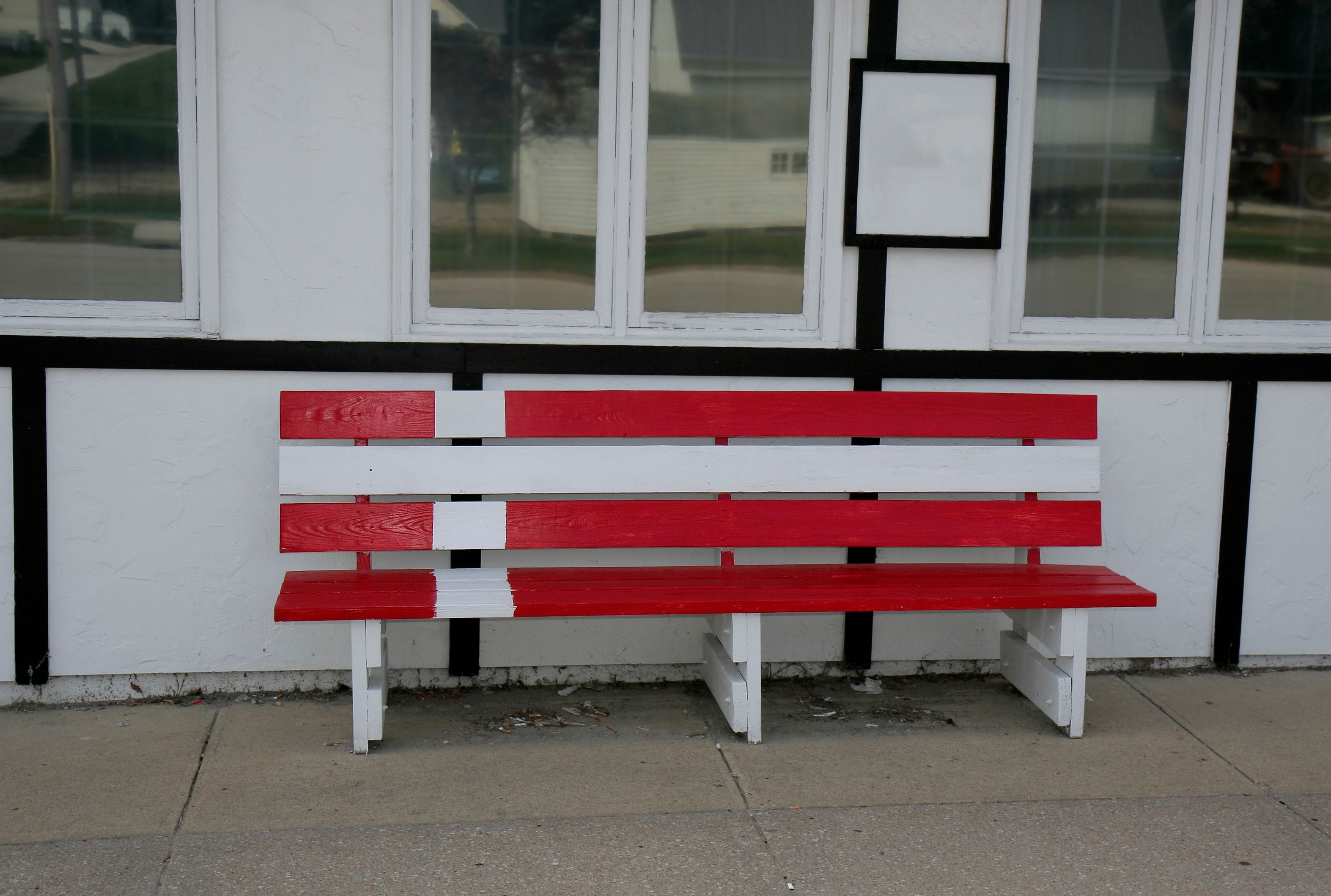 アイオワ州エルクホーンの建物の前にあるデンマーク国旗ペイントの木製ベンチ