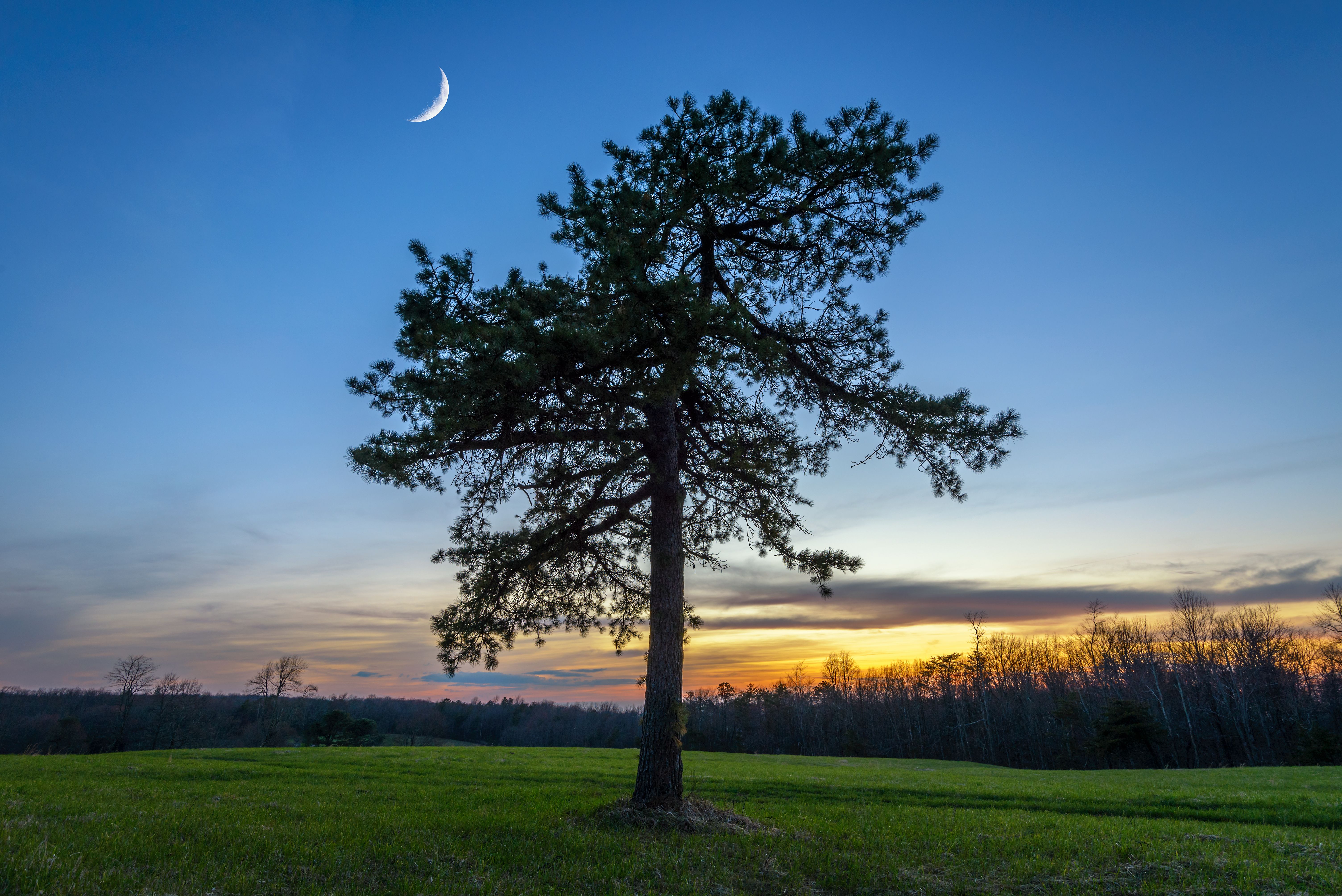 カンバーランド・ギャップ国立公園のヘンズリー集落から見た夕暮れの一本の松の木と三日月