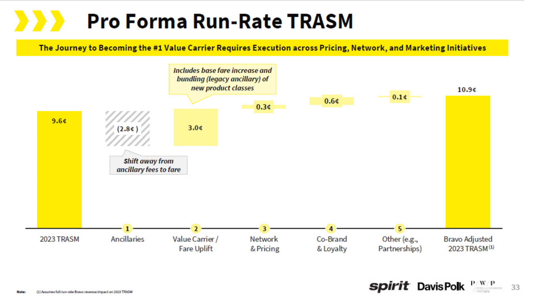 スピリット航空は、2023 年の ASM あたりの総収益 (TRASM) が 9.6 セントであるのに対し、2023 年のフルランレートの「プロジェクト ブラボー」収益が TRASM に与える影響を想定すると、変革計画調整後の TRASM は 10.9 セントになるはずであると詳細に説明しました。