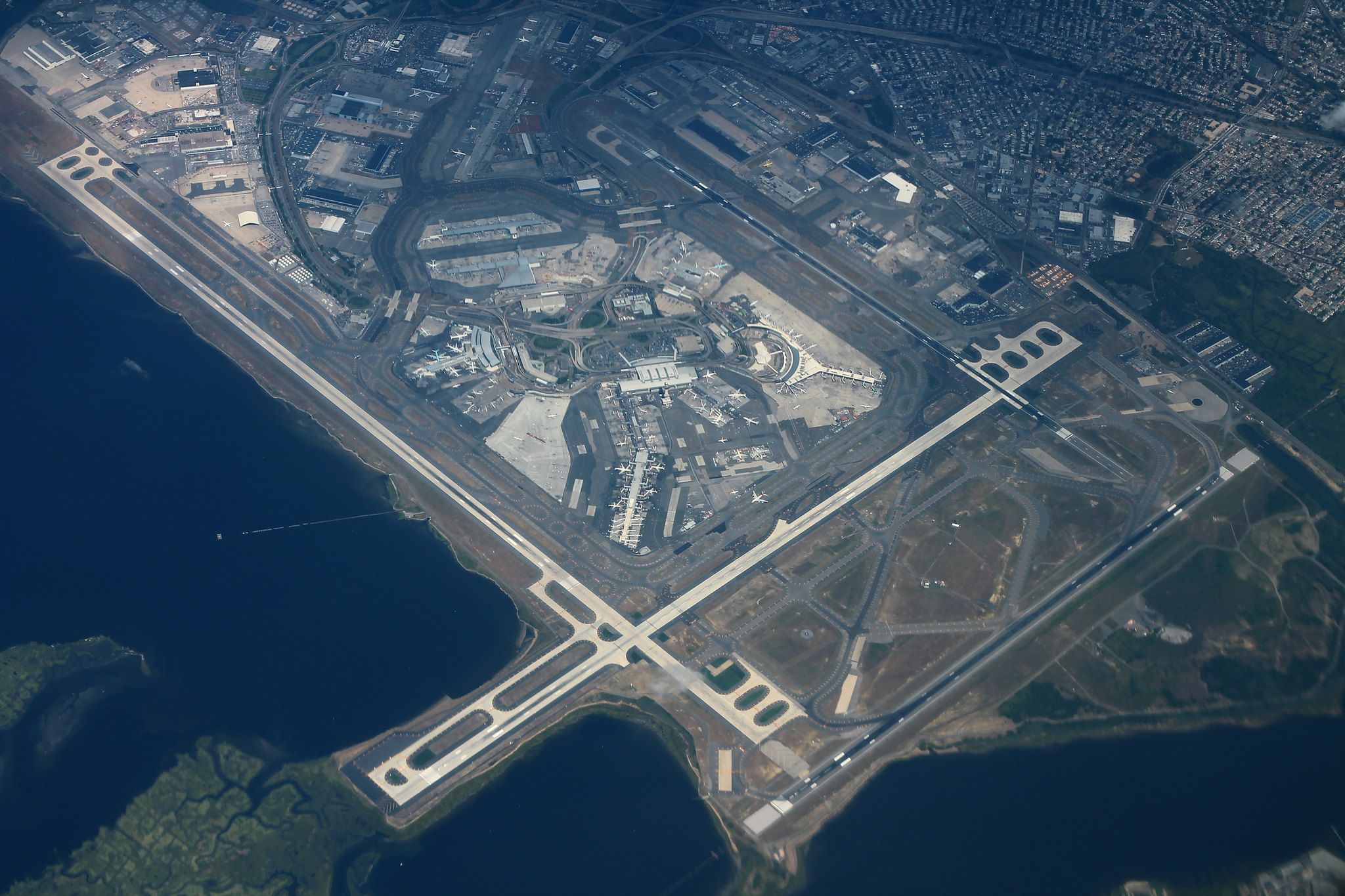 ニューヨーク JFK には 1 から 8 までの番号が付けられた 5 つのターミナルがあり、2、3、6 のターミナルは存在しません。それは、ターミナル 3 は 2014 年に取り壊され、現在はデルタ航空の航空機駐車スペースとなっている一方、ターミナル 6 は 2006 年に閉鎖され、現在はジェットブルーの駐車スペースとなっており、ターミナル 5 の拡張用スペースも提供しているためです。最近では、ターミナル 2 が 2023 年に閉鎖され、取り壊されて他のターミナルが拡張できるようになりました。