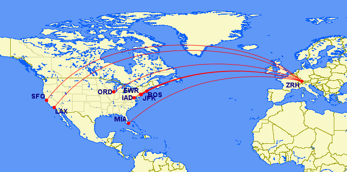 LAXとSFOへのサービスは毎日、ZRH - MIAルートは1日2回操作されます。さらに、航空会社は、ZRHから上海プードン国際空港(PVG)へのフライトを継続します。それにもかかわらず、今後の冬季のスイスの米国ネットワークを以下に示します。