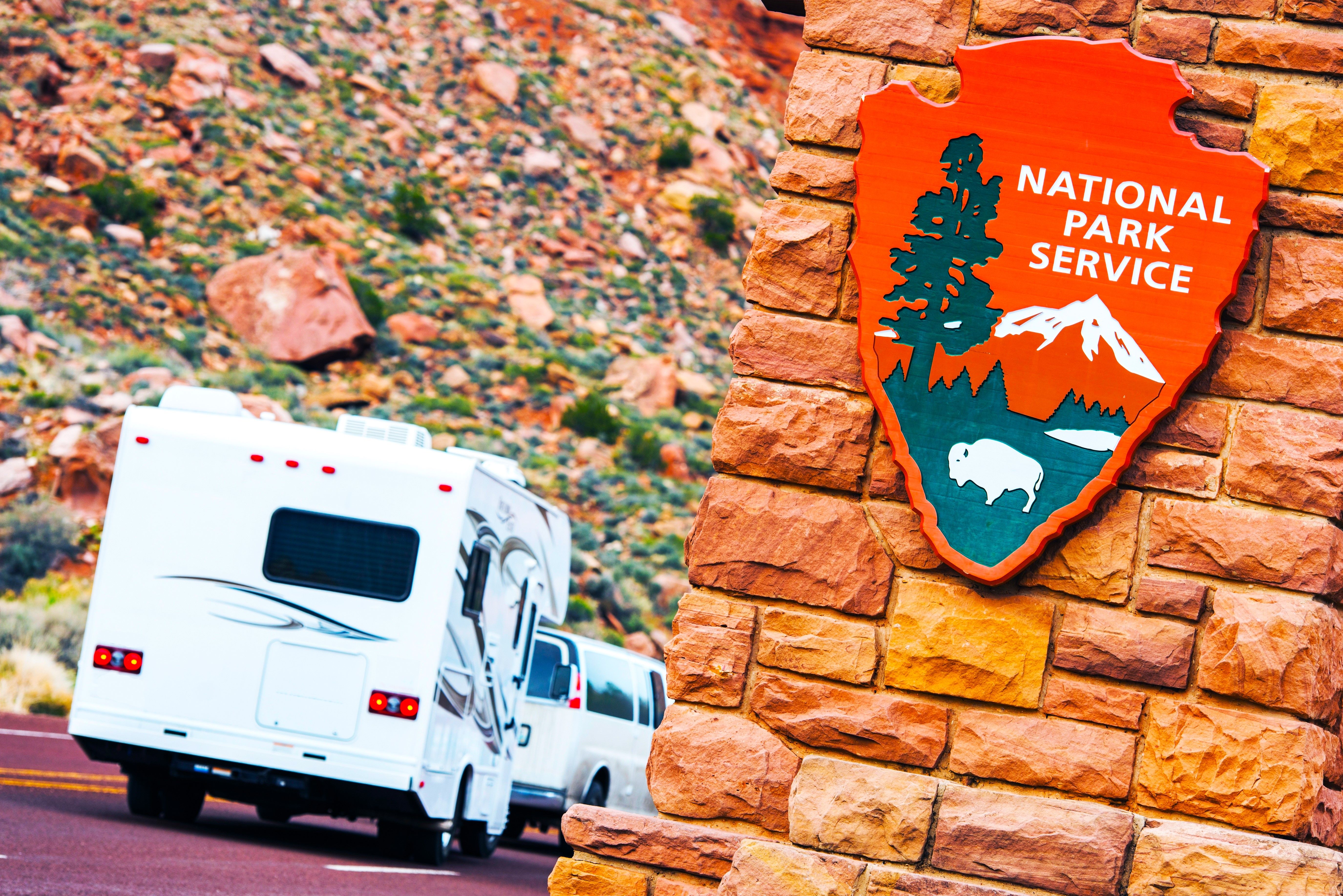 米国ユタ州ユタ州ザイオン国立公園入口にある国立公園局(NPS)の標識を通過するRV