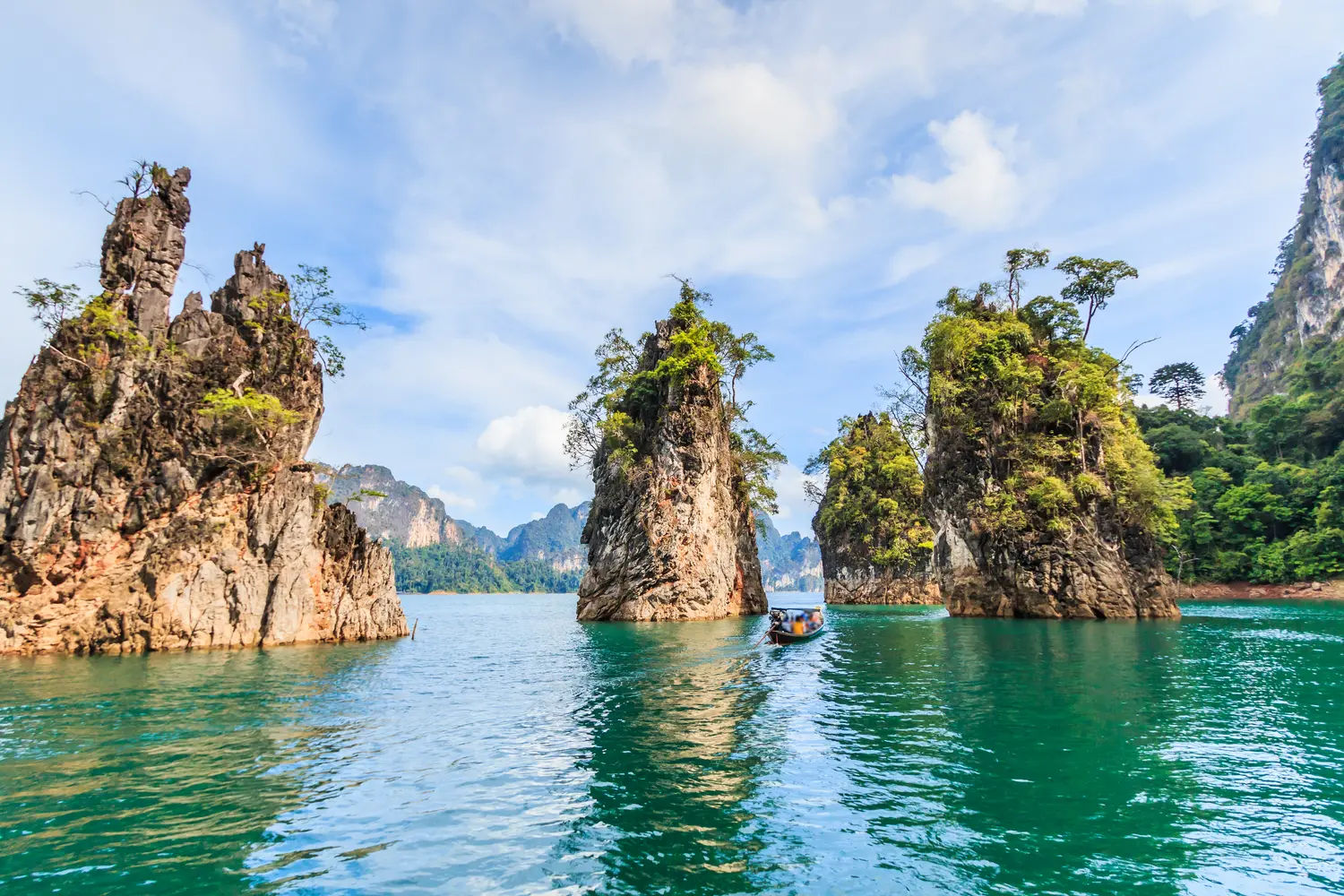 チオラン湖のロングテール ボート ツアーは、公園内で最も人気のあるツアーです。水上バンガローのいずれかに滞在する以外に、カオソック国立公園をボートでツアーするのが、公園の古典的な地形を体験する最良の方法です。ごつごつした白い柱の山々が穏やかな青い海と並置され、その見事な光景はネット上でセンセーションを巻き起こしています。