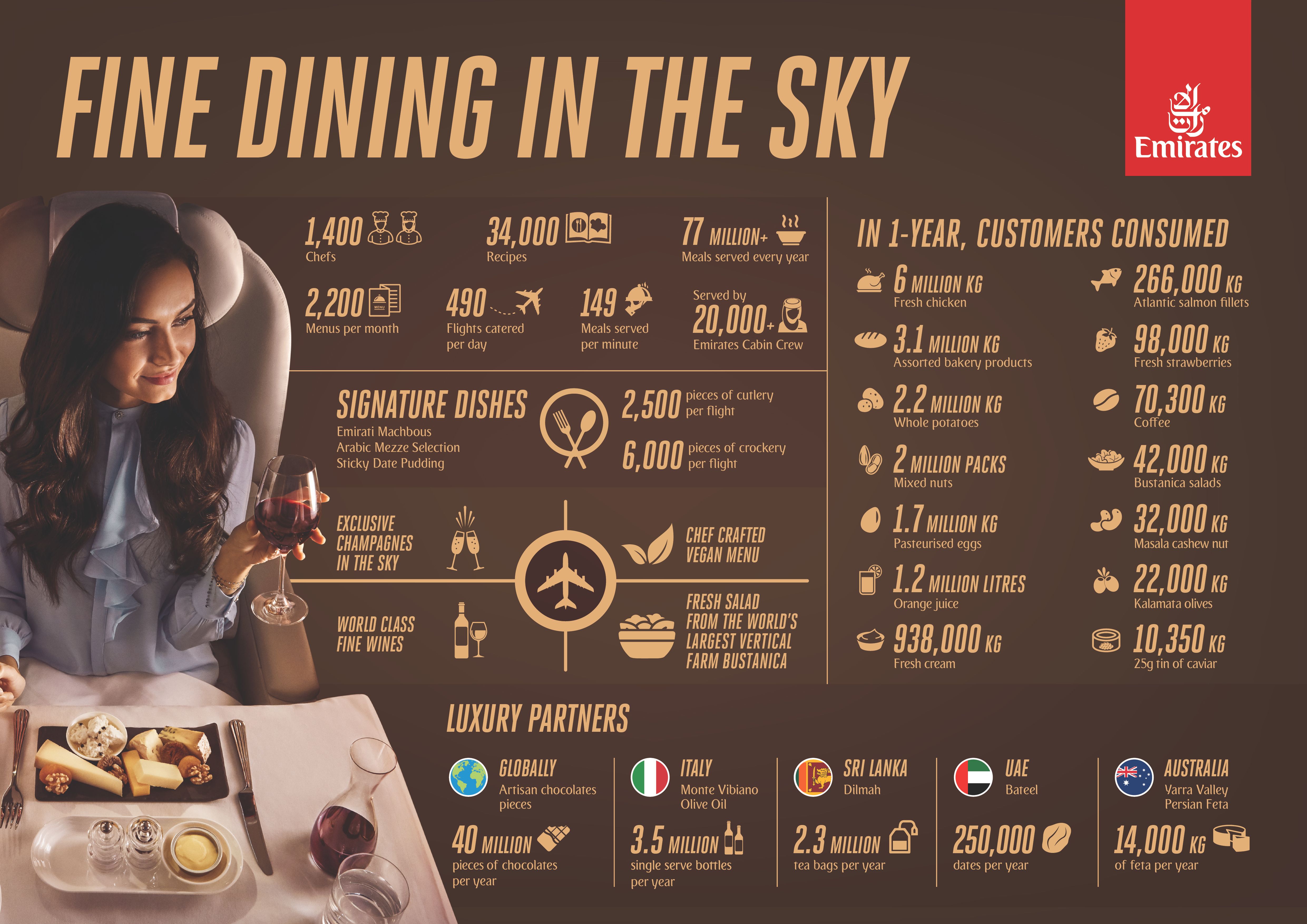 物事を視野に入れるために、エミレーツは毎分149の食事を提供しています。毎日499便のフライトを運営しており、毎日215,000の食事に相当します。